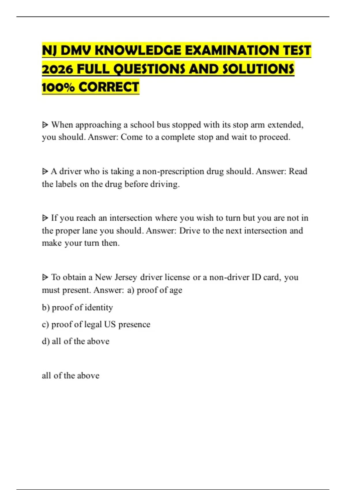 NJ DMV KNOWLEDGE EXAMINATION TEST 2026 FULL QUESTIONS AND SOLUTIONS 100% CORRECT