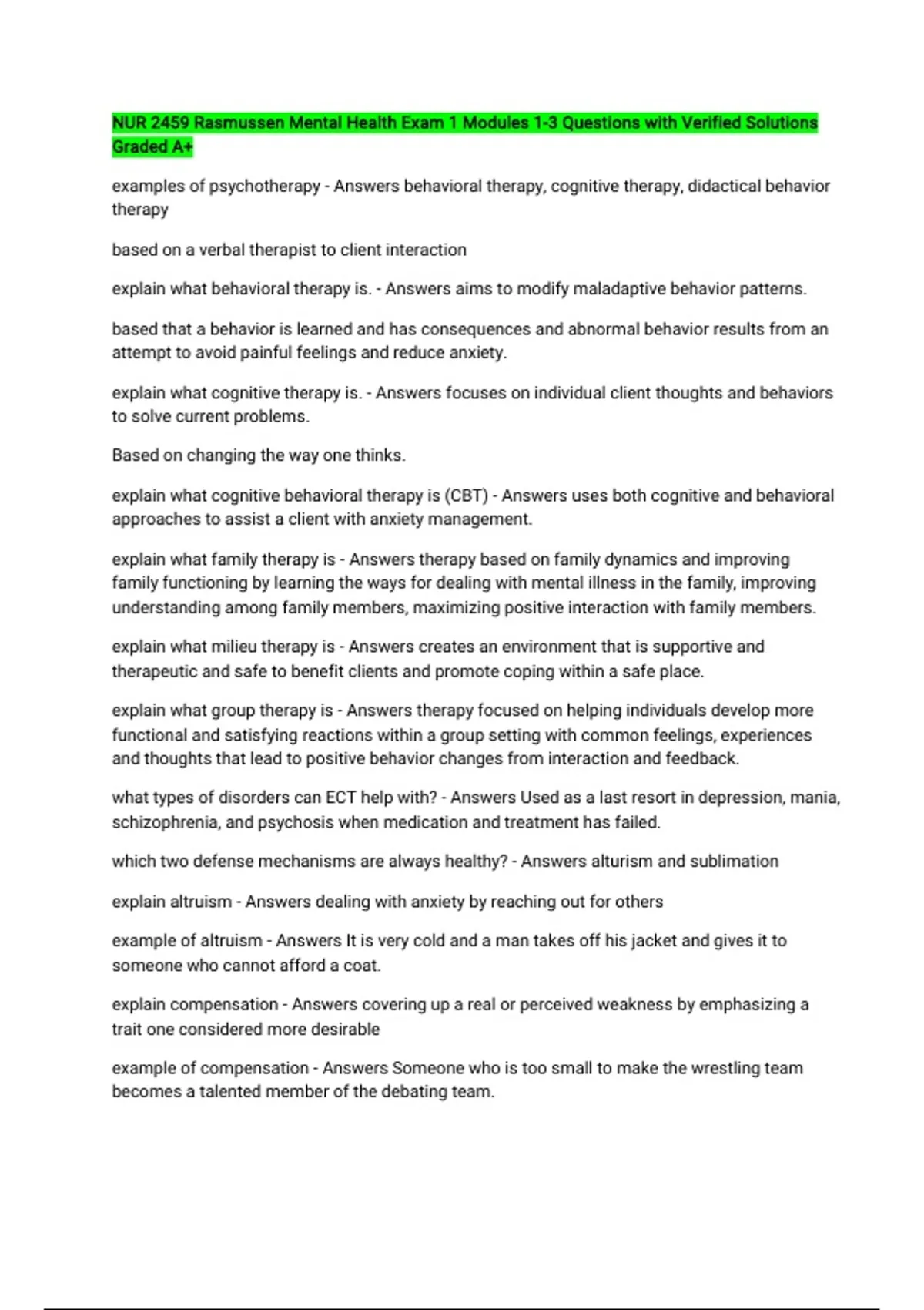 NUR 2459 Rasmussen Mental Health Exam 1 Modules 1-3 Questions with Verified Solutions Graded A+ examples of psychotherapy - Answers behavioral therapy, cognitive therapy, didactical behavior therapy based on a verbal therapist to client interaction explain what behavioral therapy is. - Answers aims to modify maladaptive behavior patterns. based that a behavior is learned and has consequences and abnormal behavior results from an attempt to avoid painful feelings and reduce anxiety. explain what cognitive therapy is. - Answers focuses on individual client thoughts and behaviors to solve current problems. Based on changing the way one thinks. explain what cognitive behavioral therapy is (CBT) - Answers uses both cognitive and behavioral approaches to assist a client with anxiety management. explain what family therapy is - Answers therapy based on family dynamics and improving family functioning by learning the ways for dealing with mental illness in the family, improving understanding among family members, maximizing positive interaction with family members. explain what milieu therapy is - Answers creates an environment that is supportive and therapeutic and safe to benefit clients and promote coping within a safe place. explain what group therapy is - Answers therapy focused on helping individuals develop more functional and satisfying reactions within a group setting with common feelings, experiences and thoughts that lead to positive behavior changes from interaction and feedback. what types of disorders can ECT help with? - Answers Used as a last resort in depression, mania, schizophrenia, and psychosis when medication and treatment has failed. which two defense mechanisms are always healthy? - Answers alturism and sublimation explain altruism - Answers dealing with anxiety by reaching out for others example of altruism - Answers It is very cold and a man takes off his jacket and gives it to someone who cannot afford a coat. explain compensation - Answers covering up a real or perceived weakness by emphasizing a trait one considered more desirable example of compensation - Answers Someone who is too small to make the wrestling team becomes a talented member of the debating team. explain denial - Answers refusing to acknowledge the existence of a real situation or feelings associated. example of denial - Answers A woman who drinks alcohol daily, refuses to acknowledge she has a problem. explain displacement - Answers shifting feelings related to an object, person, or situation to another less threatening object, person or situation.