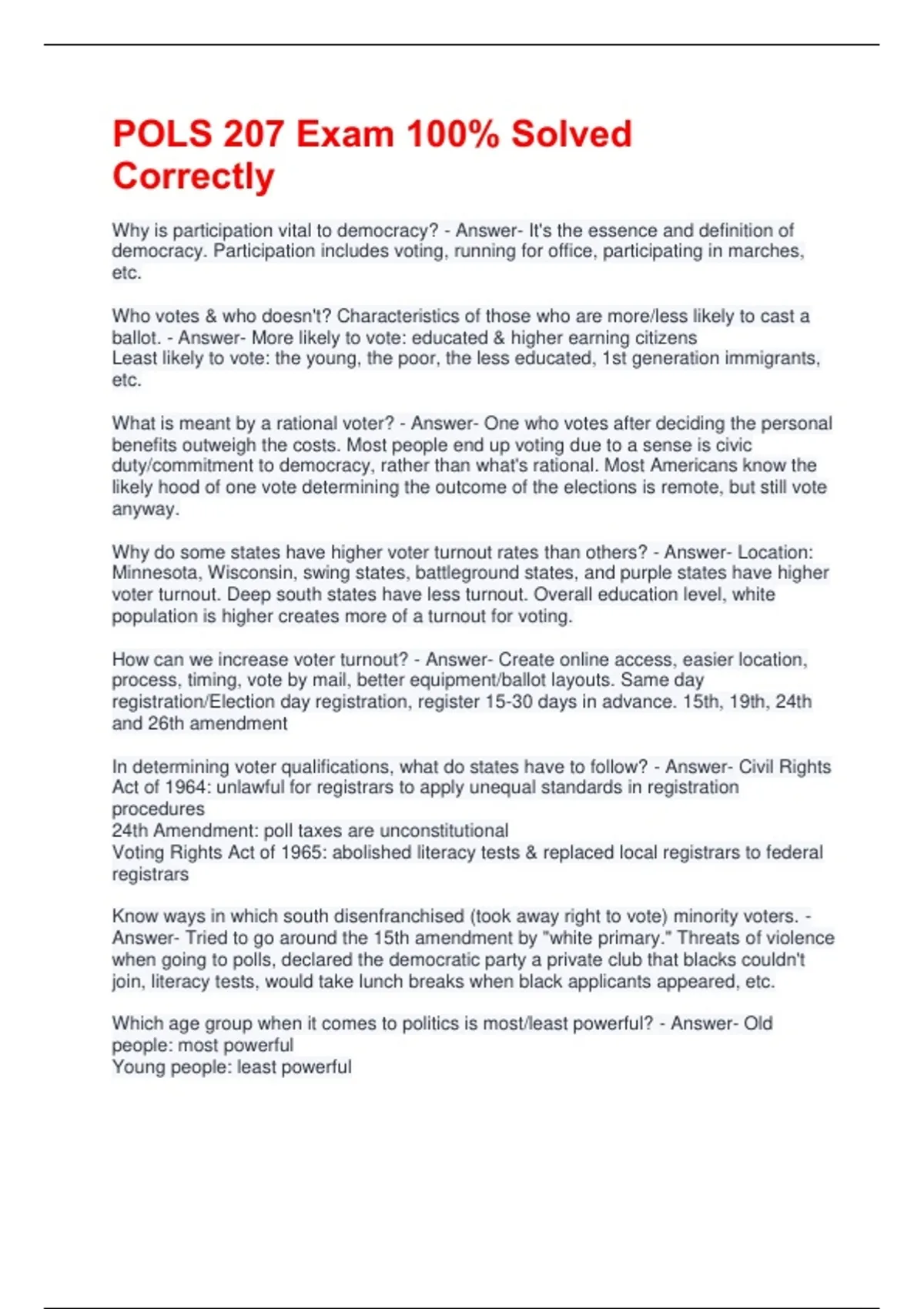 POLS 207 Exam 100% Solved Correctly Why is participation vital to democracy? - Answer- It's the essence and definition of democracy. Participation includes voting, running for office, participating in marches, etc. Who votes & who doesn't? Characteristics of those who are more/less likely to cast a ballot. - Answer- More likely to vote: educated & higher earning citizens Least likely to vote: the young, the poor, the less educated, 1st generation immigrants, etc. What is meant by a rational voter? - Answer- One who votes after deciding the personal benefits outweigh the costs. Most people end up voting due to a sense is civic duty/commitment to democracy, rather than what's rational. Most Americans know the likely hood of one vote determining the outcome of the elections is remote, but still vote anyway. Why do some states have higher voter turnout rates than others? - Answer- Location: Minnesota, Wisconsin, swing states, battleground states, and purple states have higher voter turnout. Deep south states have less turnout. Overall education level, white population is higher creates more of a turnout for voting. How can we increase voter turnout? - Answer- Create online access, easier location, process, timing, vote by mail, better equipment/ballot layouts. Same day registration/Election day registration, register 15-30 days in advance. 15th, 19th, 24th and 26th amendment In determining voter qualifications, what do states have to follow? - Answer- Civil Rights Act of 1964: unlawful for registrars to apply unequal standards in registration procedures 24th Amendment: poll taxes are unconstitutional Voting Rights Act of 1965: abolished literacy tests & replaced local registrars to federal registrars Know ways in which south disenfranchised (took away right to vote) minority voters. - Answer- Tried to go around the 15th amendment by "white primary." Threats of violence when going to polls, declared the democratic party a private club that blacks couldn't join, literacy tests, would take lunch breaks when black applicants appeared, etc. Which age group when it comes to politics is most/least powerful? - Answer- Old people: most powerful Young people: least powerful What do lobbyists do? - Answer- Have connections to politics. Can influence people in office that benefit their clients, communicate useful technical & political information, informing politics on policy preferences, knowledge of the lawmaking process. Why do states require lobbyists to register? - Answer- They want their submission reports about their membership and finances. Meant to spotlight the activities of lobbyists. What is grassroot lobbying? - Answer- Involves group efforts to get constituents to call/write to their legislature on the behalf of the groups position on pending legislation. Could be direct call, faxes, emails or letter. Interest groups influence constituents to do this because they know legislators are more likely to listen. Who do PACS give their money to? - Answer- Incumbents- people running for reelction Know the different types of interest systems - Answer- Strong party states= weak interest groups Weak party states= string interest groups Wealthy urban industrial states have weaker interest groups because of diversity. Where parties are strong, pressure groups are weak; were parties are weak, pressure groups are strong. When is protest successful? - Answer- The participation of the news media "third parties" is essential to the success of civil disobedience. Know the criteria/distinctions of the responsible party model - Answer- Develop & clarify alternative policy positions. Educate the people about issues & simplify choices for them. Recruit candidates who agree with parties positions. Organize & direct campaigns. Hold elected officials responsible. Organize legislature to ensure party control. How have media and single interest groups affected the electoral process? - Answer- Media is the way to expose candidates on TV, radio or newspapers Why are primaries important? What do they actually do for the system? - Answer- They democratized the nomination process and narrow it down to 2 candidates Know the different types of primaries - Answer- Closed: only voters who have previously registered as members of a party may vote in that primary election Semi-open: allow voters to change party registration on election day Open: chose when they enter the polling place which party primary they wish to vote on Blanket: both parties appear on the same ballot Runoff: additional vote held between top 2 voters in a primary where no candidates recieved majority votes Be able to describe the party structure - Answer- National chair, national committee, state committee, county committee, city/ward/precinct committee, party-in-the-electorate What do national committees do for the parties? - Answer- Exist primarily for the purpose of holding national conventions every 4 years to select the parties presidential campaign raises and spends money on political campaign, not only during elections but between elections