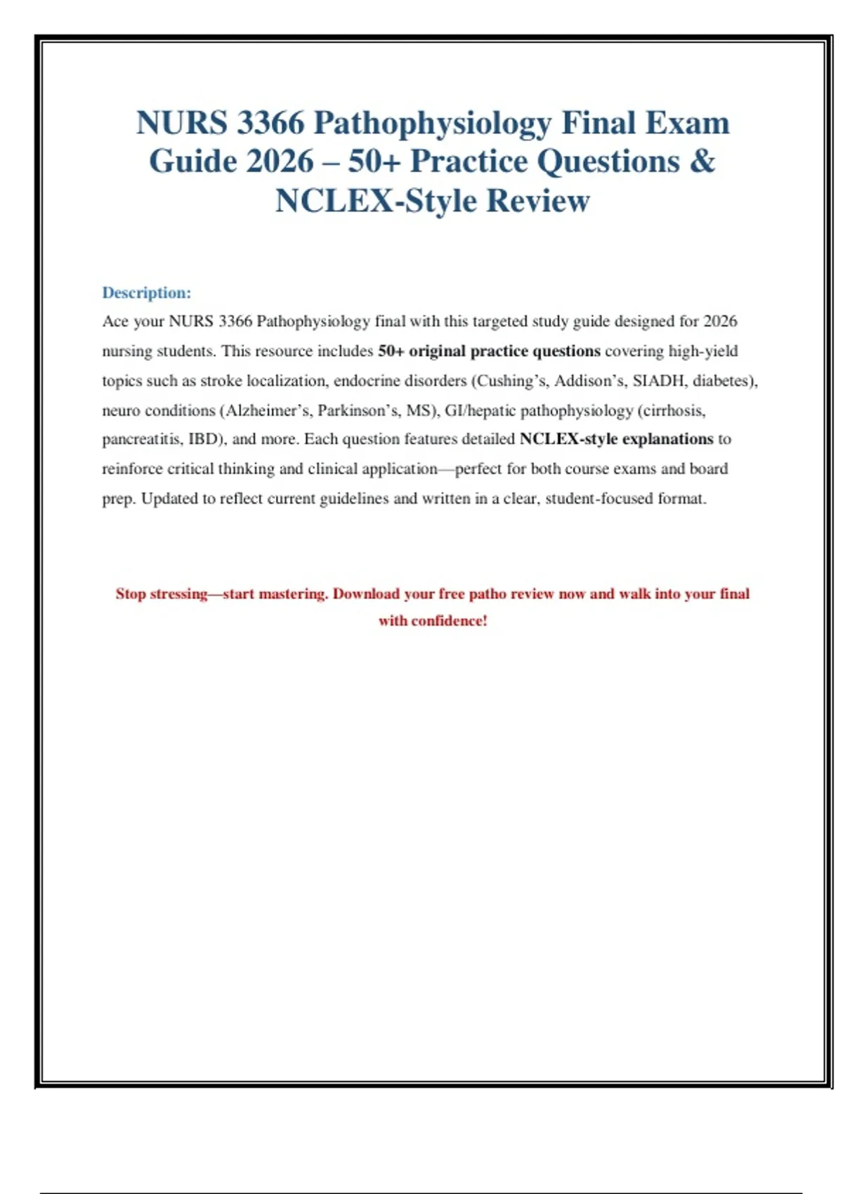 , NURS 3366 Patho Final Exam Study Guide 2026: Pathophysiology