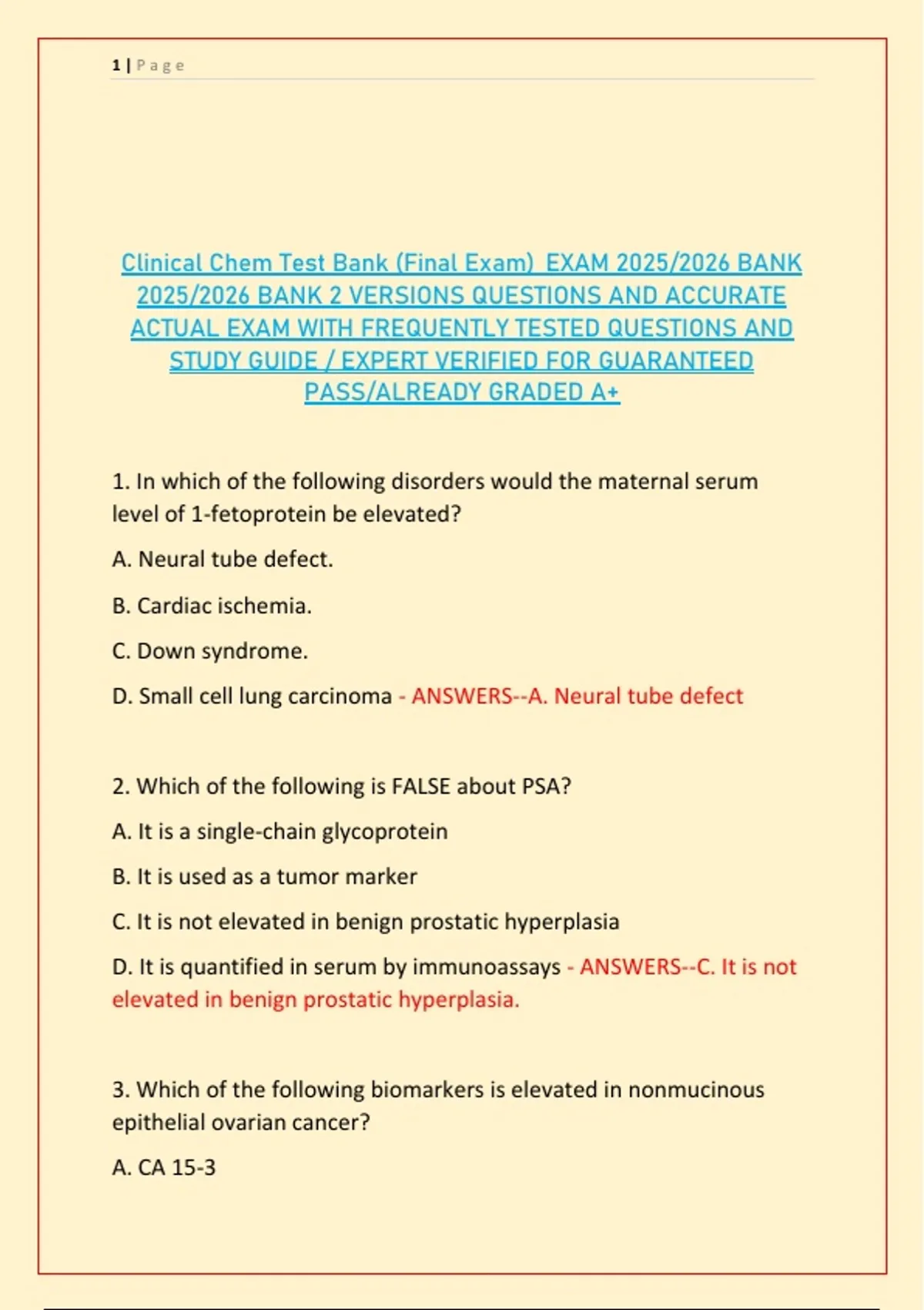 Clinical Chem Test Bank (Final Exam) EXAM 2025/2026 BANK