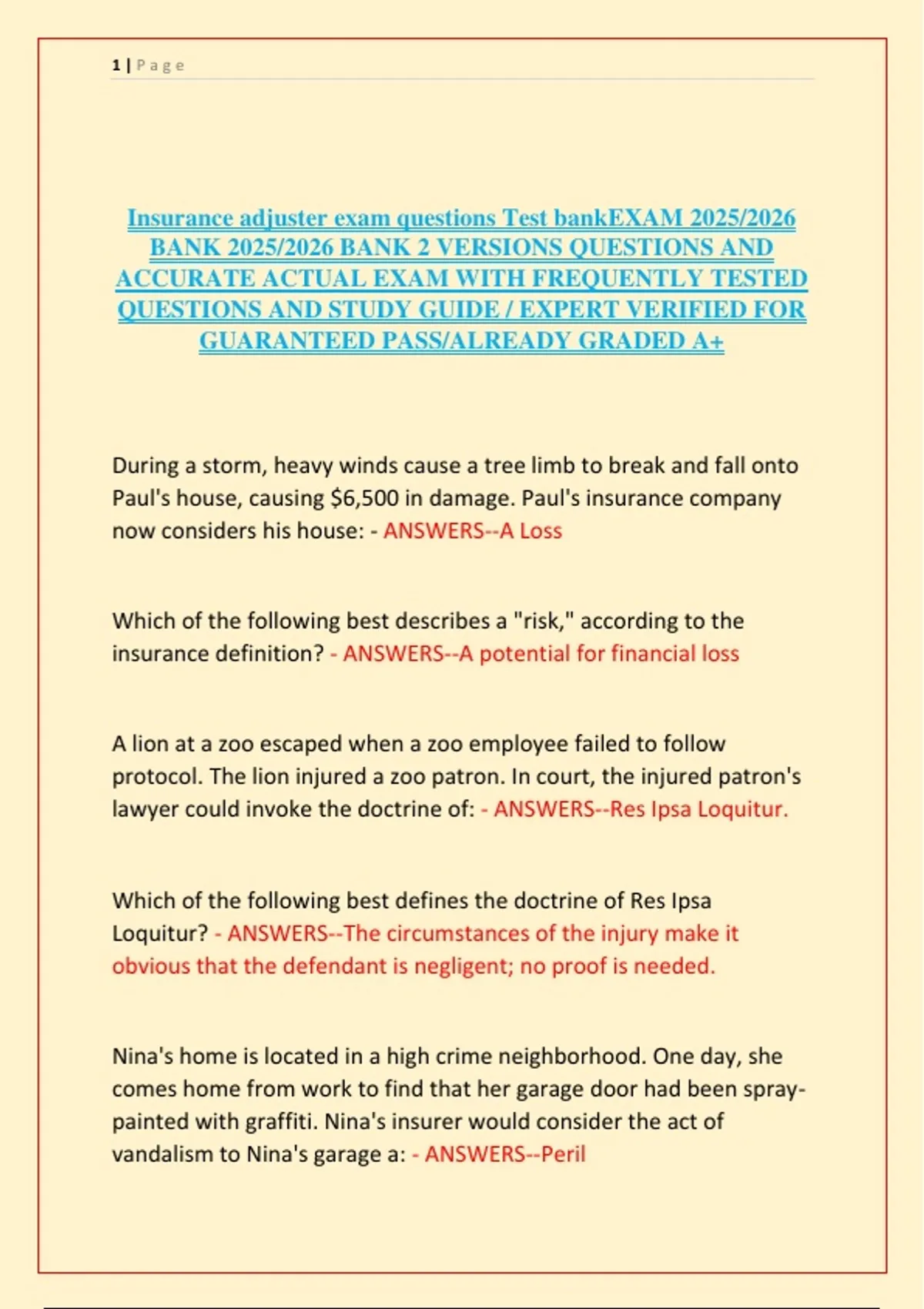 Insurance adjuster exam questions Test bankEXAM 2025/2026