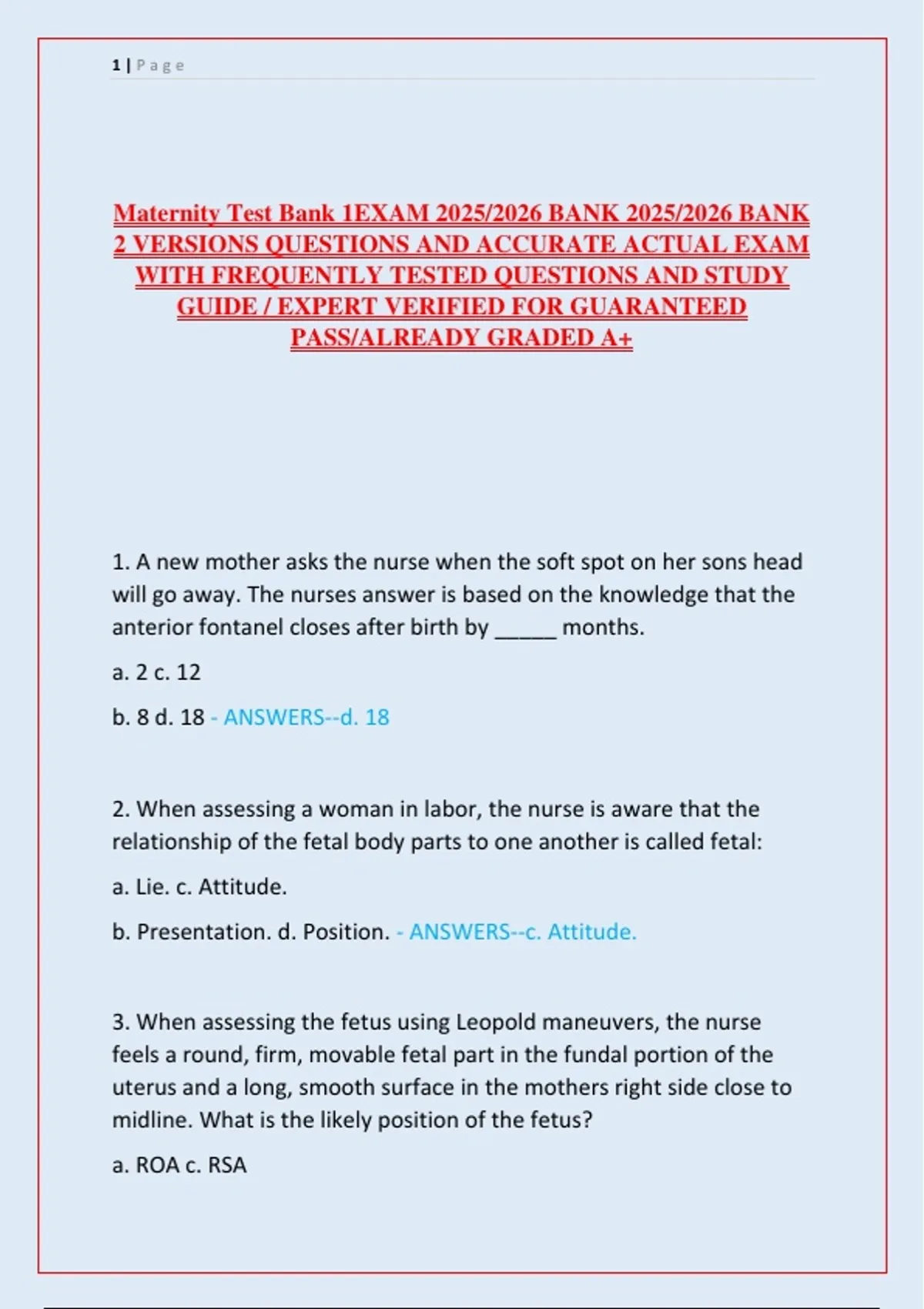 Maternity Test Bank 1EXAM 2025/2026 BANK 2025/2026 BANK