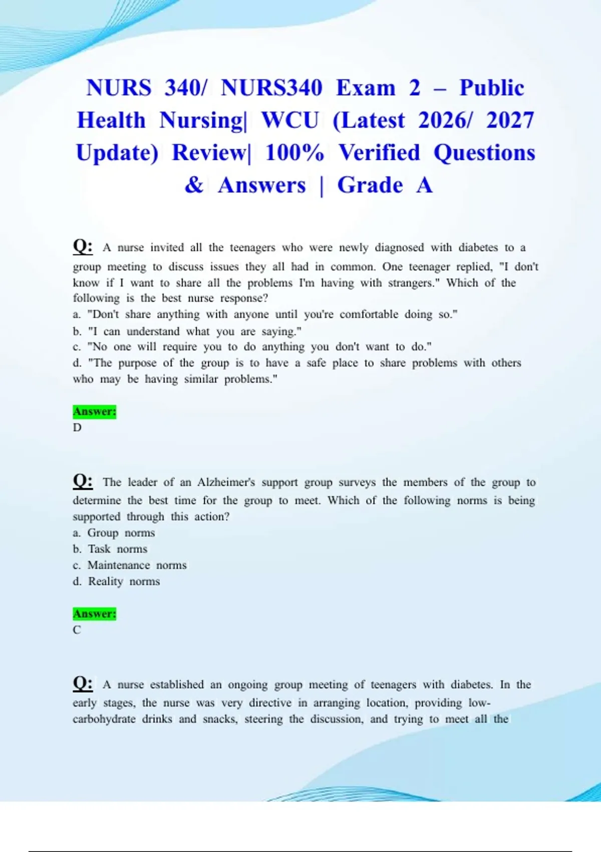 NURS 340/ NURS340 Exam 2 – Public Health Nursing| WCU (Latest 2026/ 2027 Update) Review| 100% Verified Questions & Answers | Grade A