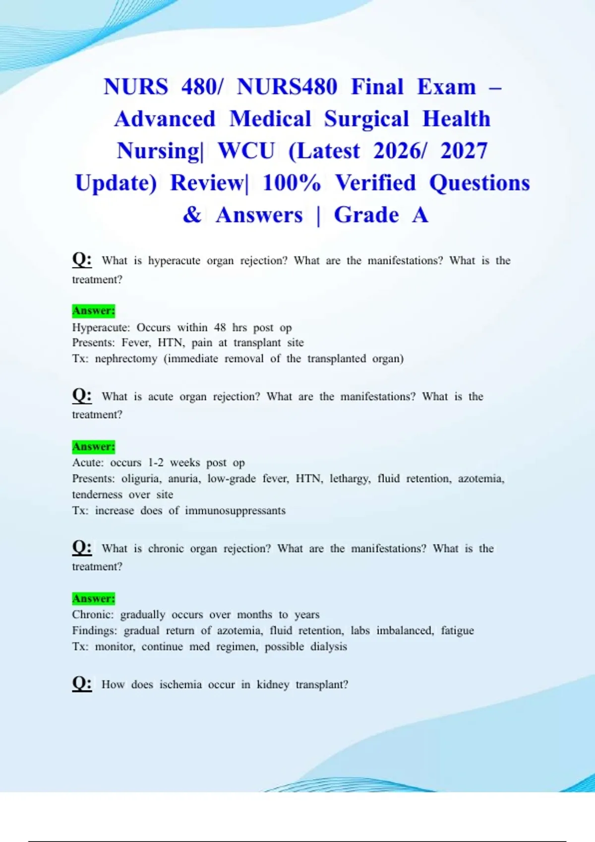 NURS 480/ NURS480 Final Exam – Advanced Medical Surgical Health Nursing| WCU (Latest 2026/ 2027 Update) Review| 100% Verified Questions & Answers | Grade A