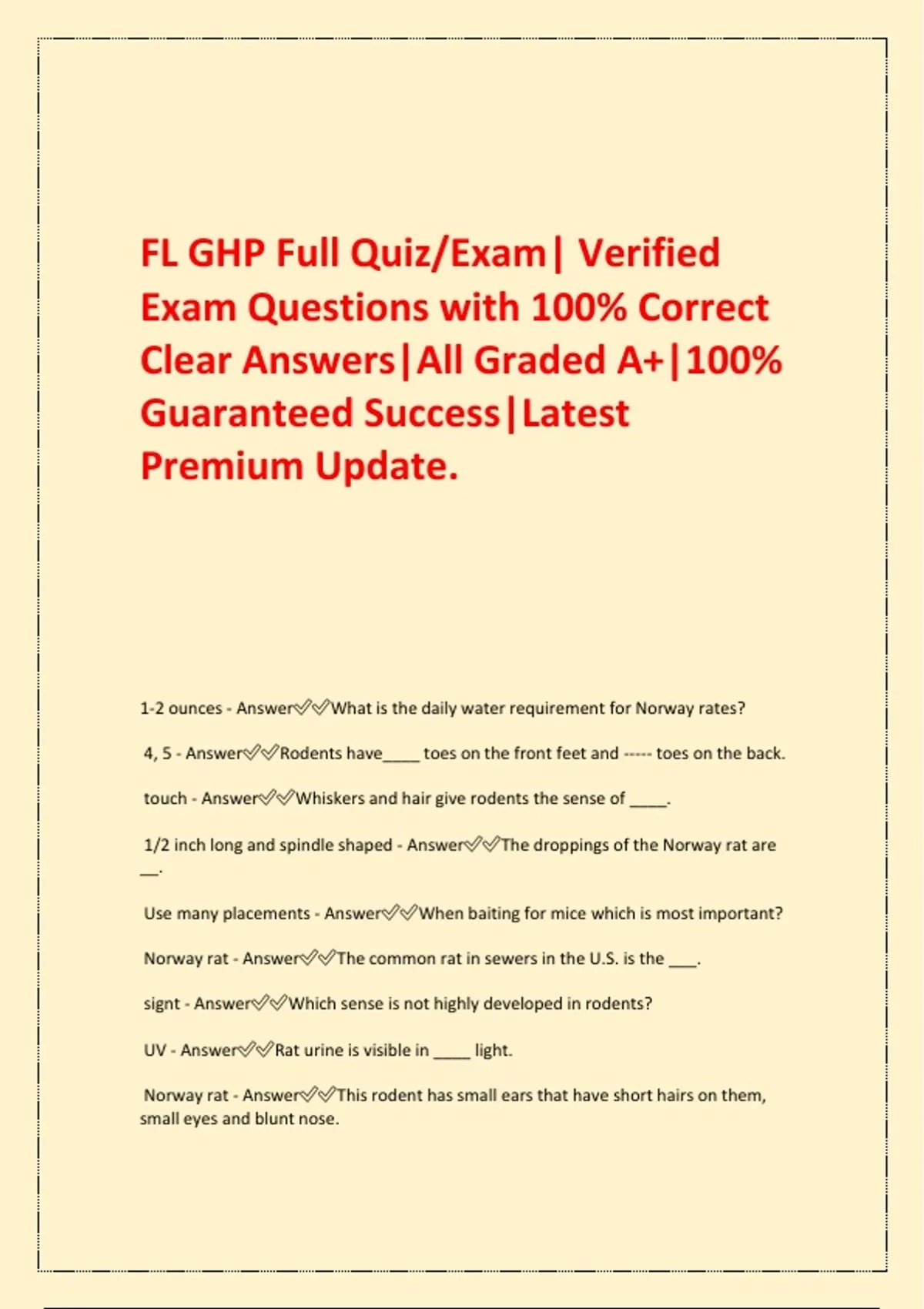 FL GHP Full Quiz/Exam| Verified Exam Questions with 100% Correct Clear Answers|All Graded A+|100% Guaranteed Success|Latest Premium Update. 1-2 ounces - AnswerWhat is the daily water requirement for Norway rates? 4, 5 - AnswerRodents have____ toes on the front feet and ----- toes on the back. touch - AnswerWhiskers and hair give rodents the sense of ____. 1/2 inch long and spindle shaped - AnswerThe droppings of the Norway rat are __. Use many placements - AnswerWhen baiting for mice which is most important? Norway rat - AnswerThe common rat in sewers in the U.S. is the ___. signt - AnswerWhich sense is not highly developed in rodents? UV - AnswerRat urine is visible in ____ light. Norway rat - AnswerThis rodent has small ears that have short hairs on them, small eyes and blunt nose. trapping in the dark corners of an attic or soffets area - AnswerWhen trapping for the roof rat most success is achieved by... meats, fish and cereals - AnswerThe Norway rat prefers ___. Plague - AnswerRats may transmit ____. Outdoors in underground burrows - AnswerThe Norway rat prefers to nest ___. use a product with Bromethalin - AnswerWhen a rodent develops a resistance to warfarin you should.. short - AnswerThe hairs on the ears of the Norway rats are____. 12 - 30 - AnswerThe range of the house mouse is ___ feet from the nest. urine - AnswerRats mark their trails with ___. 1/4 inch long and spindle shaped - AnswerThe droppings of the house mouse are ___. Preventing blood from clotting - AnswerAnticoagulants work by... Field mouse - AnswerWhich rodent has a heavy body and short tail? They work in 1 to 3 days - AnswerWhich is not true of the second generation anticoagulant baits. 10% - AnswerRats can eat the equivalent of _% of their body weight. The hind foot of the mouse is less than an inch in length and the rat's is an inch or more - AnswerHow do you differentiate between a mouse and a young rat? native to FL - AnswerWhich of the following is not true of the roof rat? AKA the Black rat, vectored the plague, native to FL, or large ears and eyes plaster bagworms - AnswerWhich of the following feeds on spider webs? Plaster beetles, wasps, plaster bagworms, or casemaking clothes moth Ammonia - AnswerThe guano of bats has the distinct smell of? Fungal lung diseases - AnswerBat and bird droppings carry which type of disease? Fungal lung diseases, relapsing fever, St. Louis Encephalitis, or Rabies Omnivores - AnswerCrickets are ... Carnivores, herbivores, omnivores, or cannibals 1 - AnswerHow many times per year do honey bees swarm? injecting digestive fluids to break down cells and then ingest them - AnswerChiggers feed by... seed tick - AnswerThe first instar larva of a tick is referred to as the... seed, nymph, initial molt, larvite True - AnswerT/F When brown ticks infest dogs; the larvae and nymphs are found in the long hair on the back False - AnswerT/F Bedbug females have pointed abdomen tips. itch mites - AnswerThe following is a true human parasite that is spread by close personal contact and is a cause of scabies. head lice, pubic lice, chiggers, or itch mites tiny paper splinters that can cause bite like sores - AnswerPaper mites are... through sexual contact - AnswerThe most common way that pubic lice are transmitted.... 6 - AnswerMost flea eggs will hatch in how many days? False - AnswerT/F Treating of the mattress and bedding with residual insecticides is an accepted method for treatment of bedbugs. There is no role for pest management involvement - AnswerWhat is the best control for head lice? 12 to 14 days - AnswerUnder optimal conditions the flea can go from egg to adult in.... fission - AnswerPharroh ants reproduce colonies by.. abamectin - AnswerThe active ingredient in Ascend fire ant bait is... Carpenter - AnswerWhich type of ant has a parent colony that is most often found outdoors in dead wood such as tree holes and landscape timbers? RIFA - AnswerWhich ant's sting can kill a human? Harvester, RIFA, Twig, or Velvet Carpenter satellite nest - AnswerWhich is the most likely ant to be found in a dry warm attic? Acrobat, White footed, Carpenter, Pharaoh interfering with energy production - AnswerHydramethylnon works by