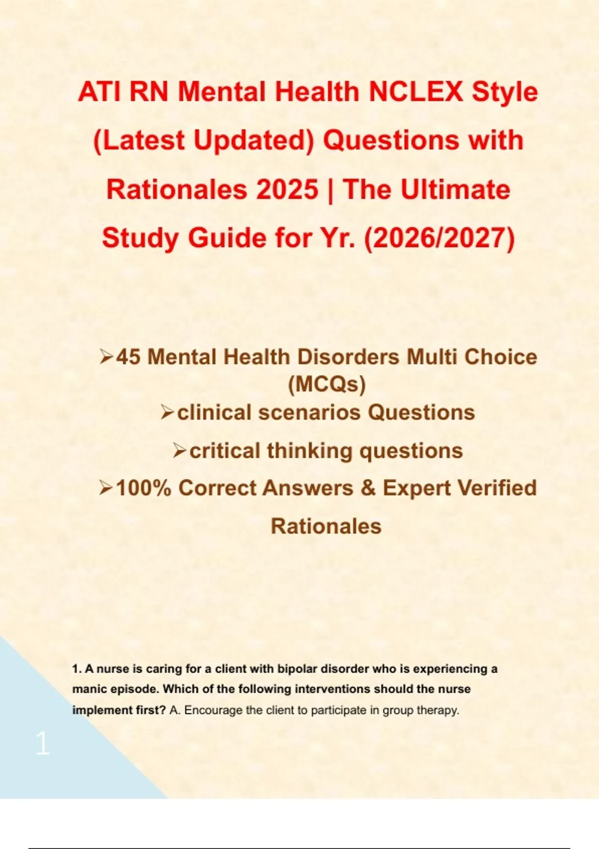 1. A nurse is caring for a client with bipolar disorder who is experiencing a