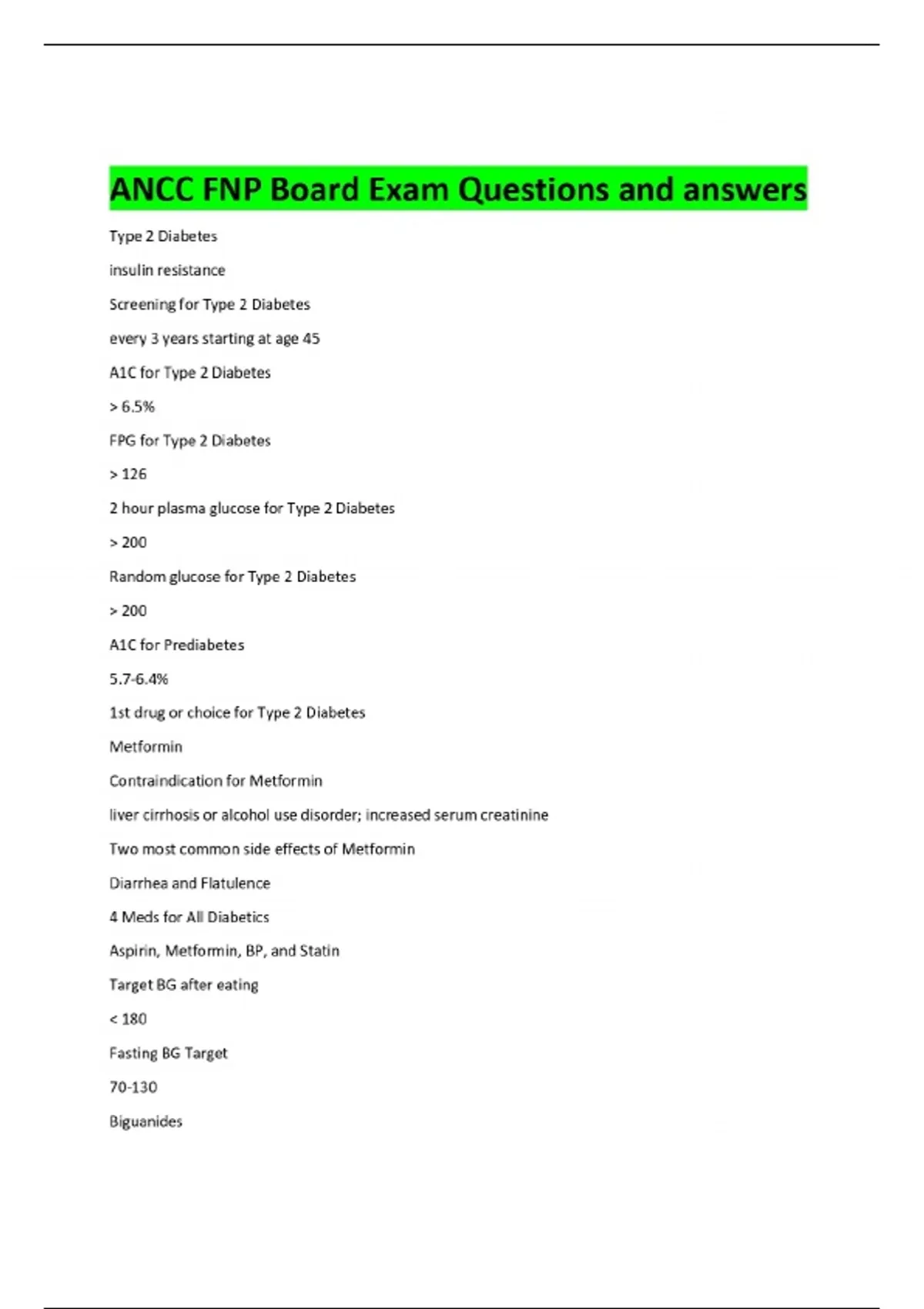 ANCC FNP Board Exam Questions and answers Type 2 Diabetes insulin resistance Screening for Type 2 Diabetes every 3 years starting at age 45 A1C for Type 2 Diabetes > 6.5% FPG for Type 2 Diabetes > 126 2 hour plasma glucose for Type 2 Diabetes > 200 Random glucose for Type 2 Diabetes > 200 A1C for Prediabetes 5.7-6.4% 1st drug or choice for Type 2 Diabetes