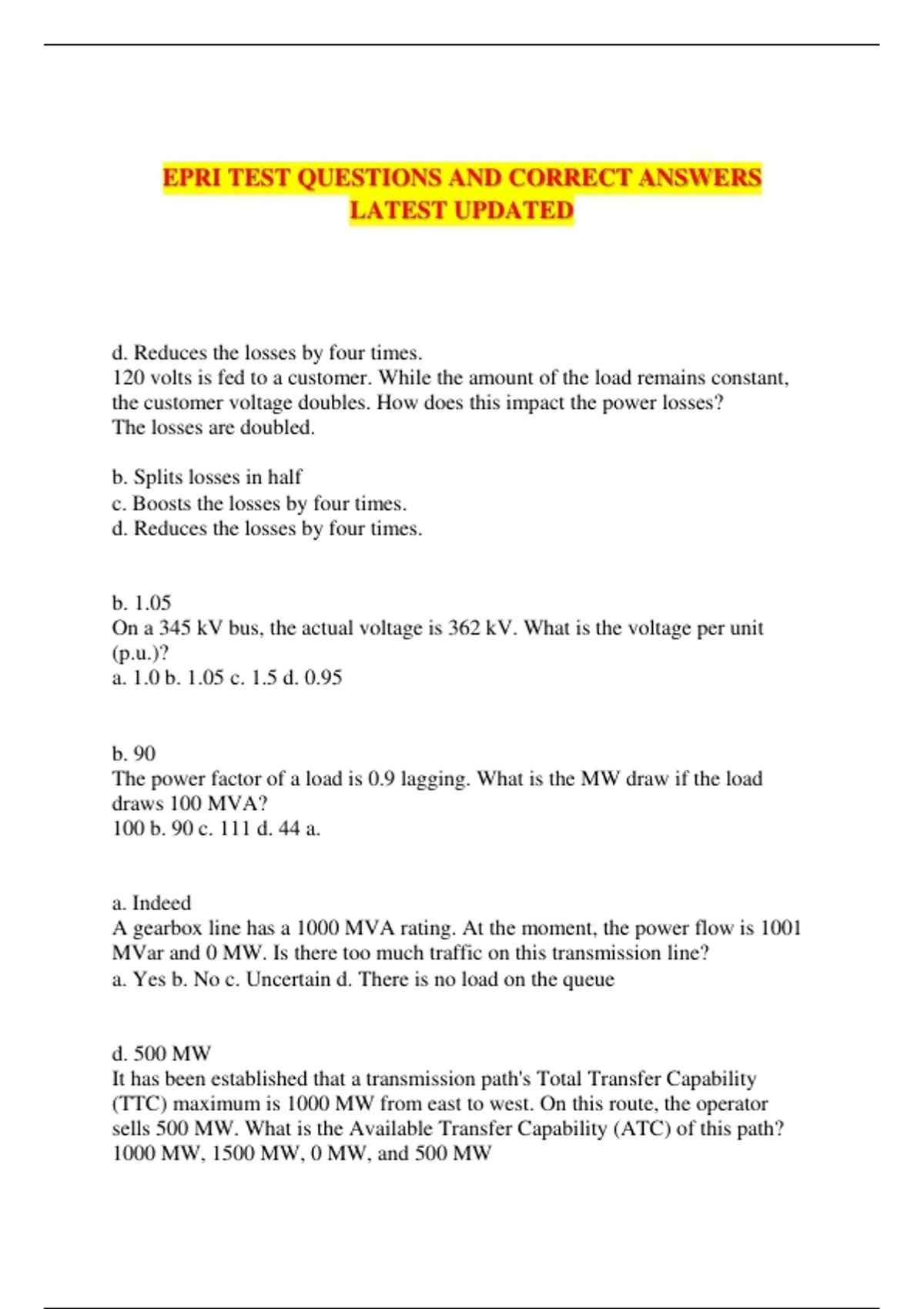 EPRI TEST QUESTIONS AND CORRECT ANSWERS