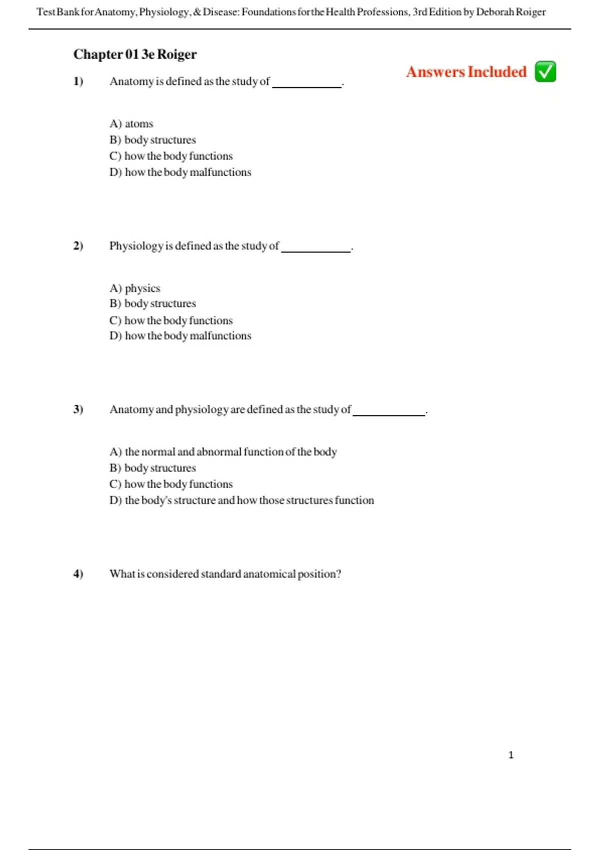 Test Bank for Anatomy, Physiology, & Disease: Foundations for the Health Professions, 3rd Edition by Deborah Roiger. This resource includes all questions and verified answer keys for Chapters 1 through 10. Perfect for nursing, allied health, and pre-med students, this test bank supports exam preparation, concept review, and self-assessment. Each chapter covers essential topics such as anatomical terminology, body systems, homeostasis, pathology, histology, skin, skeletal and muscular systems, nervous system, special senses, endocrine system, blood, and cardiovascular system. Includes multiple-choice questions with answers for effective study and practice.