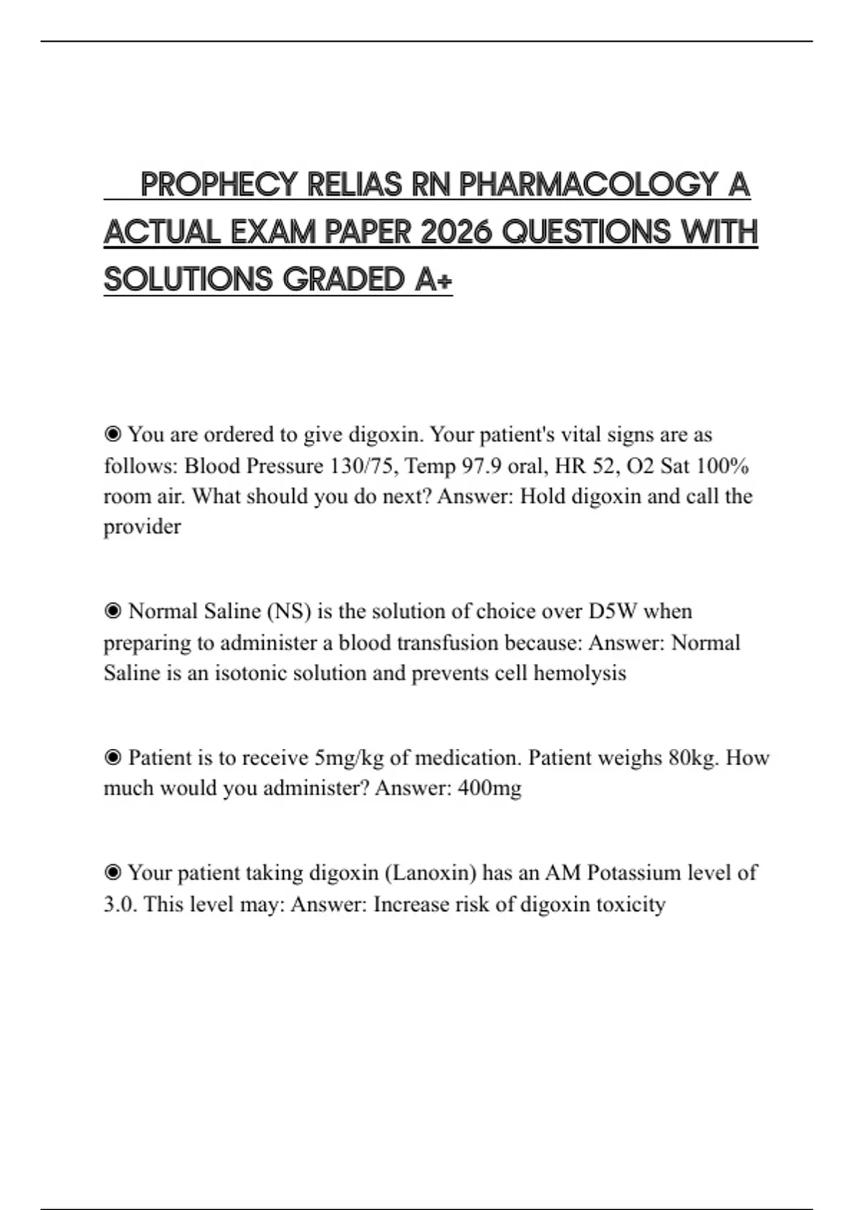 PROPHECY RELIAS RN PHARMACOLOGY A ACTUAL EXAM PAPER 2026 QUESTIONS WITH SOLUTIONS GRADED A+
