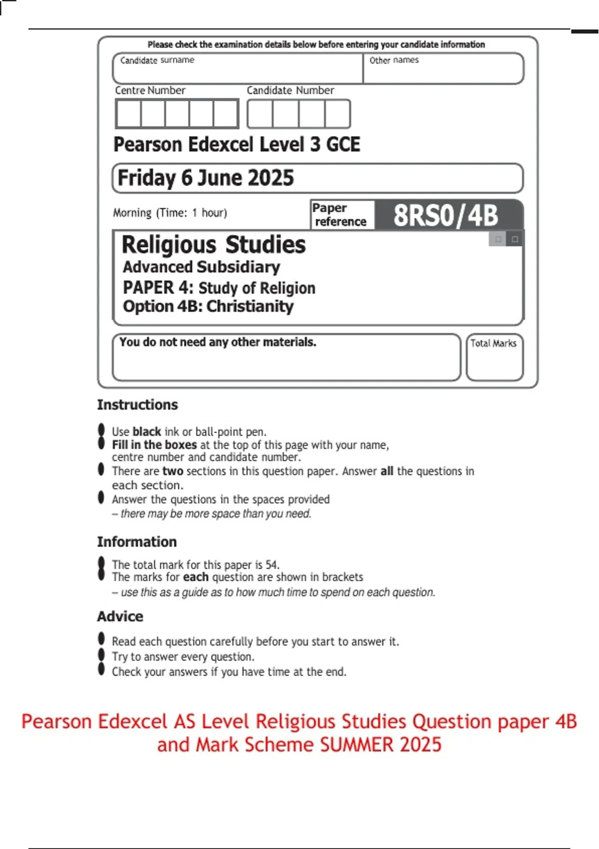 Pearson Edexcel AS Level Religious Studies Question paper 4B and Mark Scheme SUMMER 2025