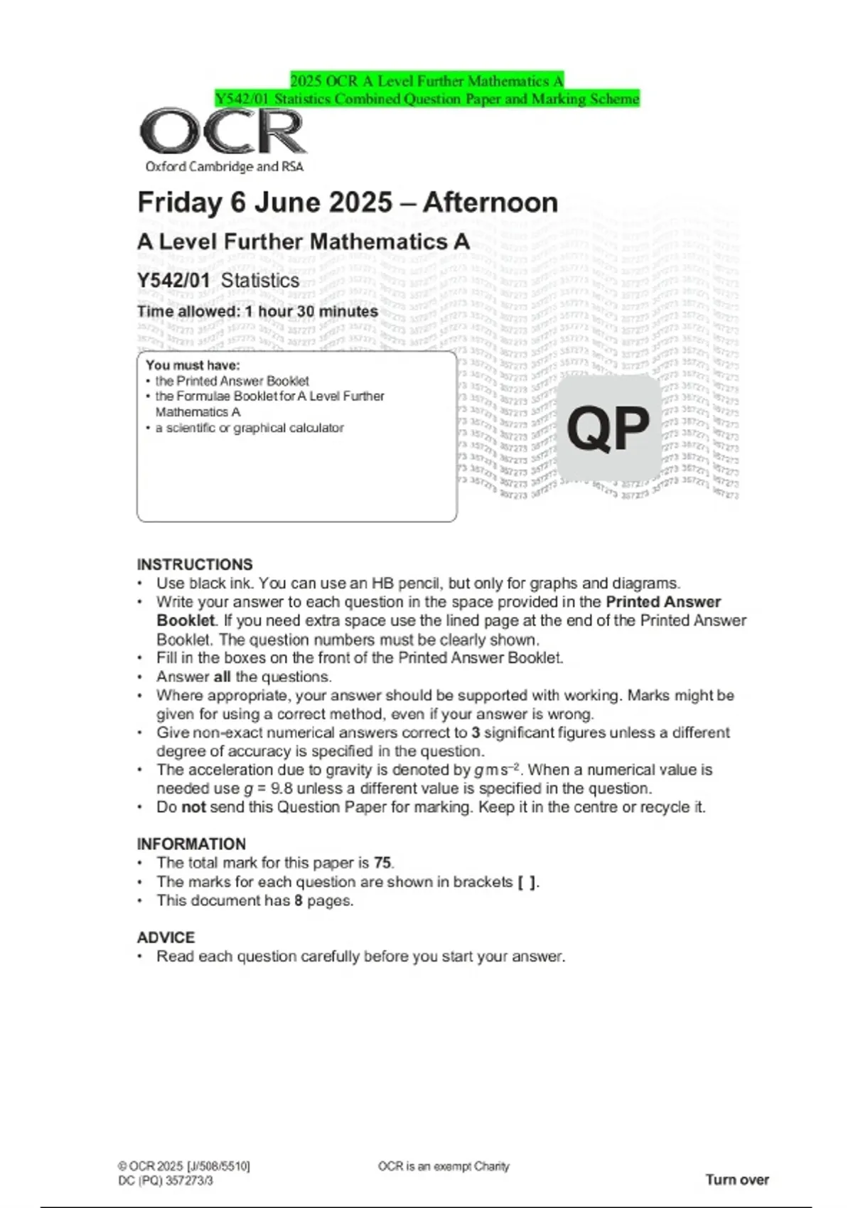 2025 OCR A Level Further Mathematics A Y542/01 Statistics Combined Question Paper and Marking Scheme
