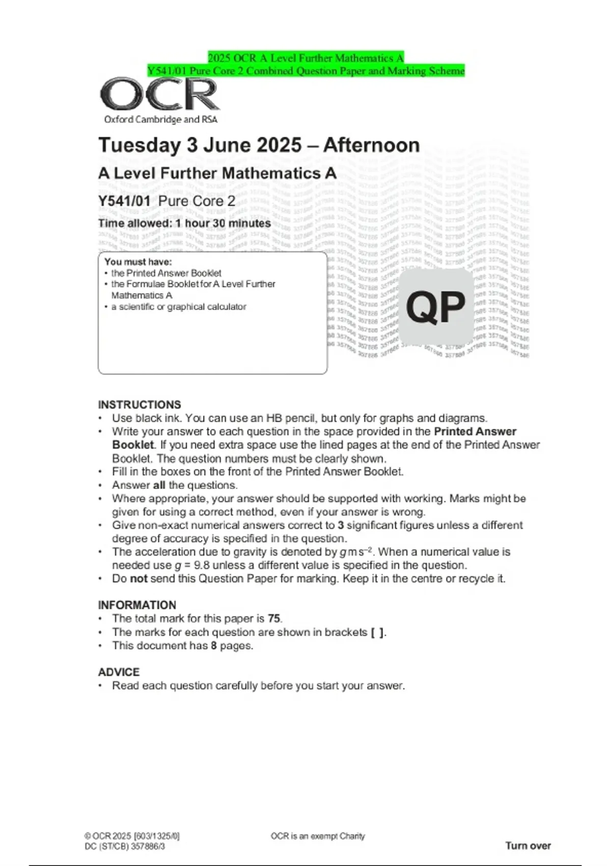 2025 OCR A Level Further Mathematics A Y541/01 Pure Core 2 Combined Question Paper and Marking Scheme