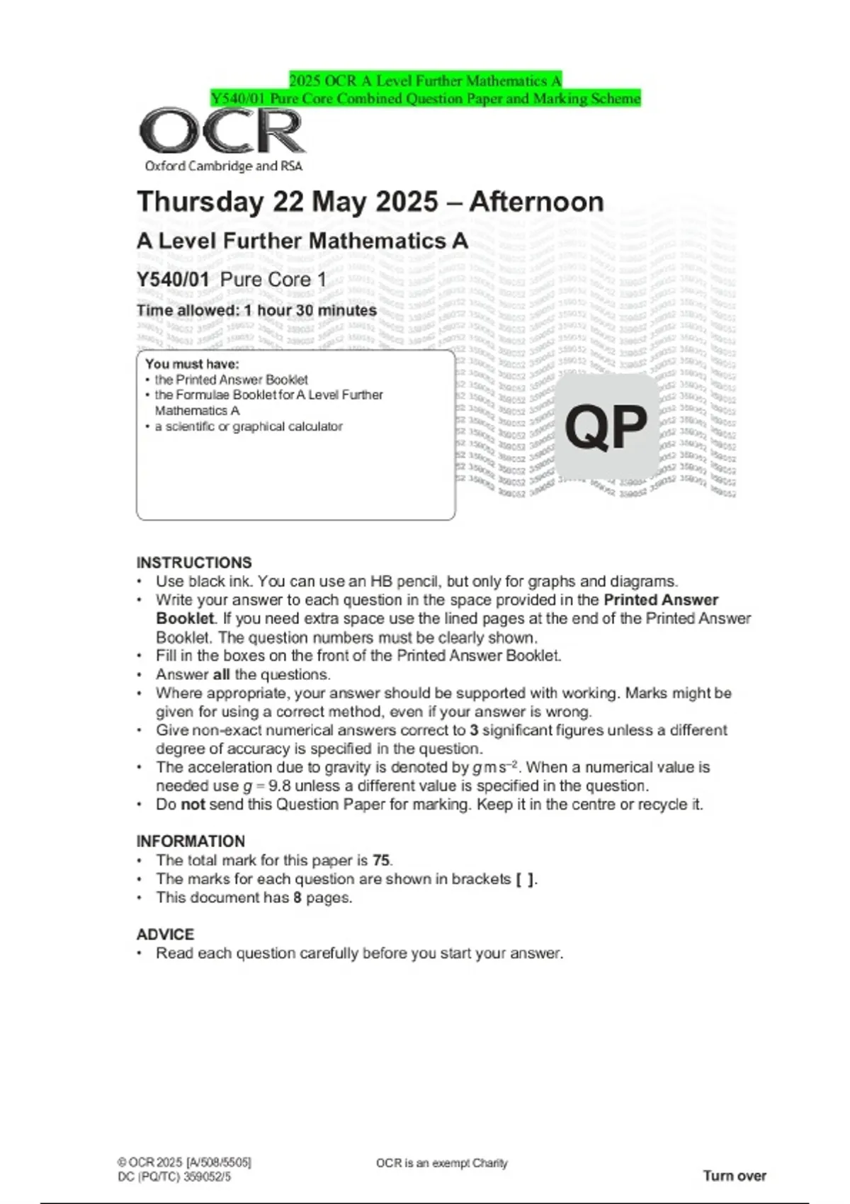 2025 OCR A Level Further Mathematics A Y540/01 Pure Core Combined Question Paper and Marking Scheme
