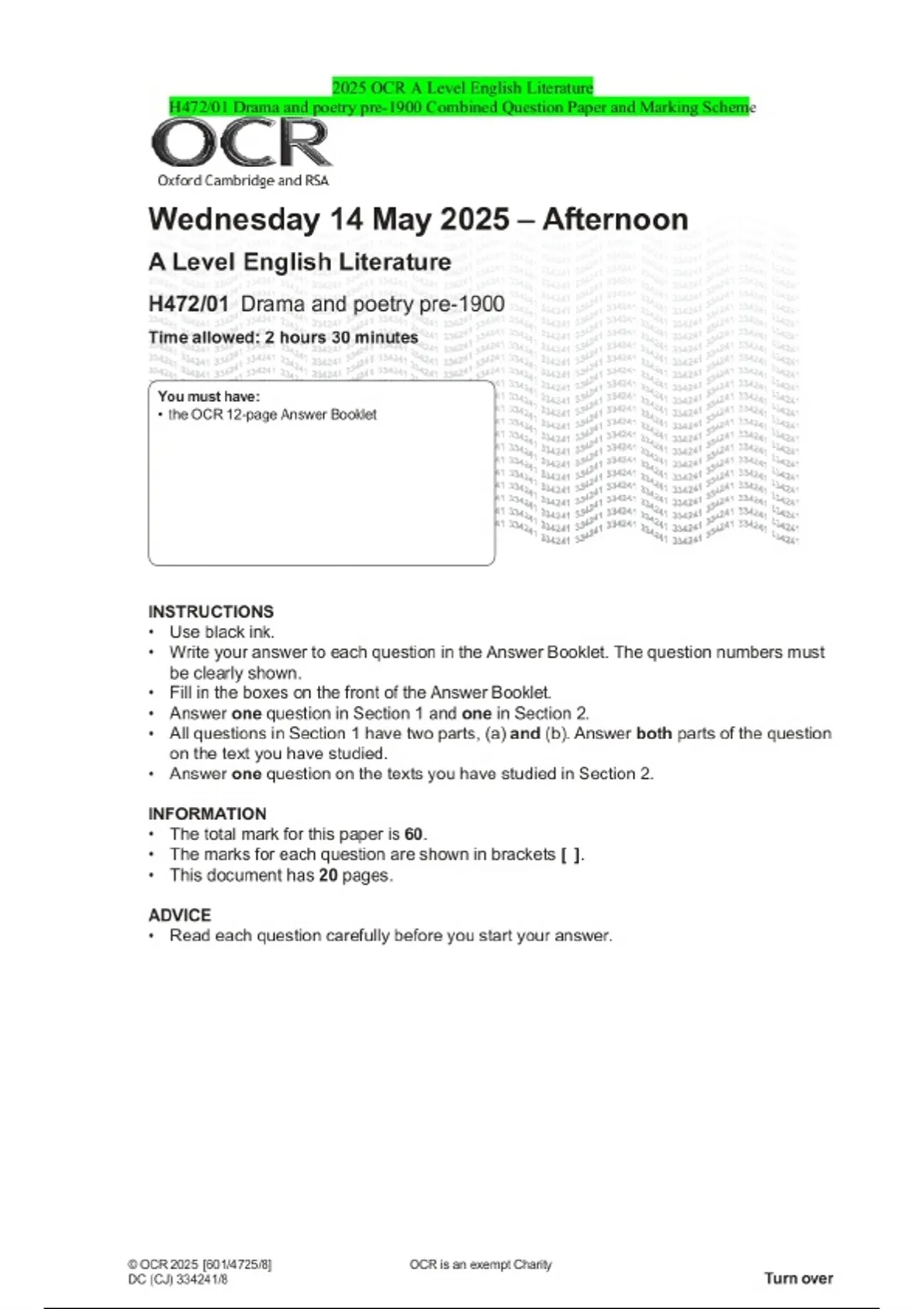 2025 OCR A Level English Literature H472/01 Drama and poetry pre-1900 Combined Question Paper and Marking Scheme