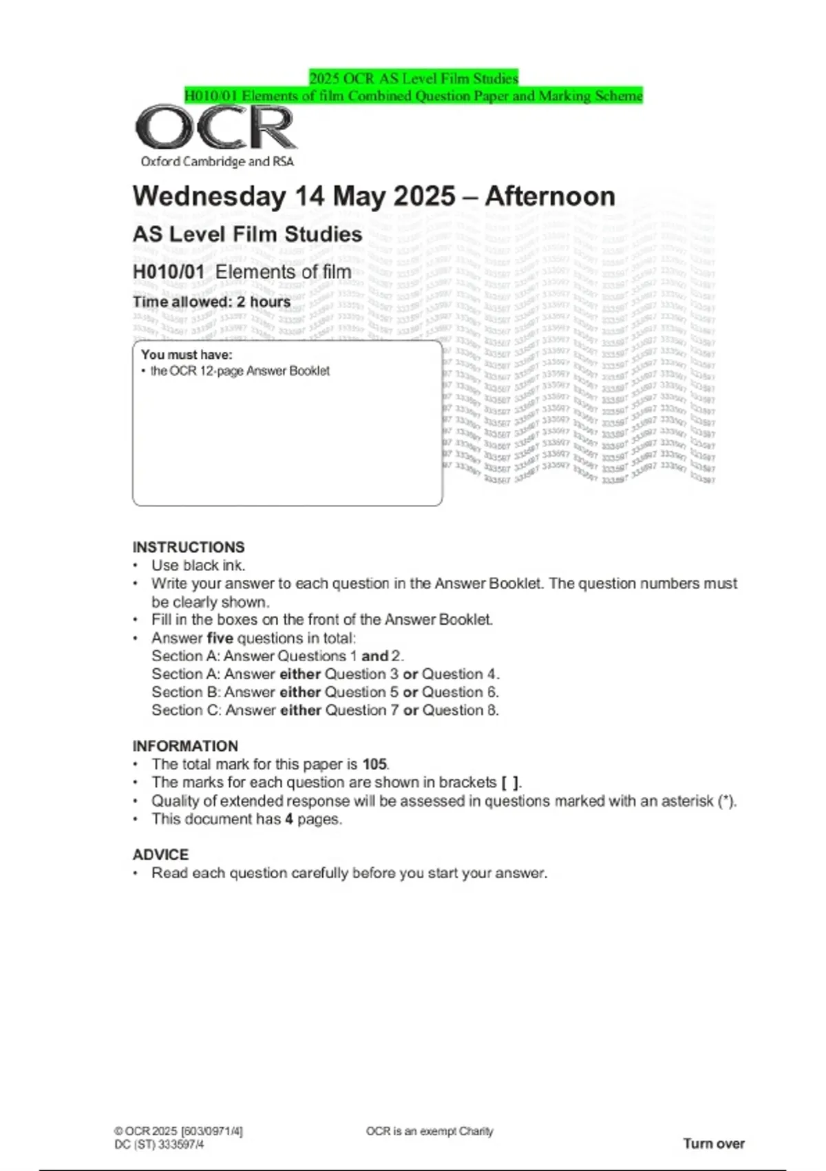 2025 OCR AS Level Film Studies H010/01 Elements of film Combined Question Paper and Marking Scheme