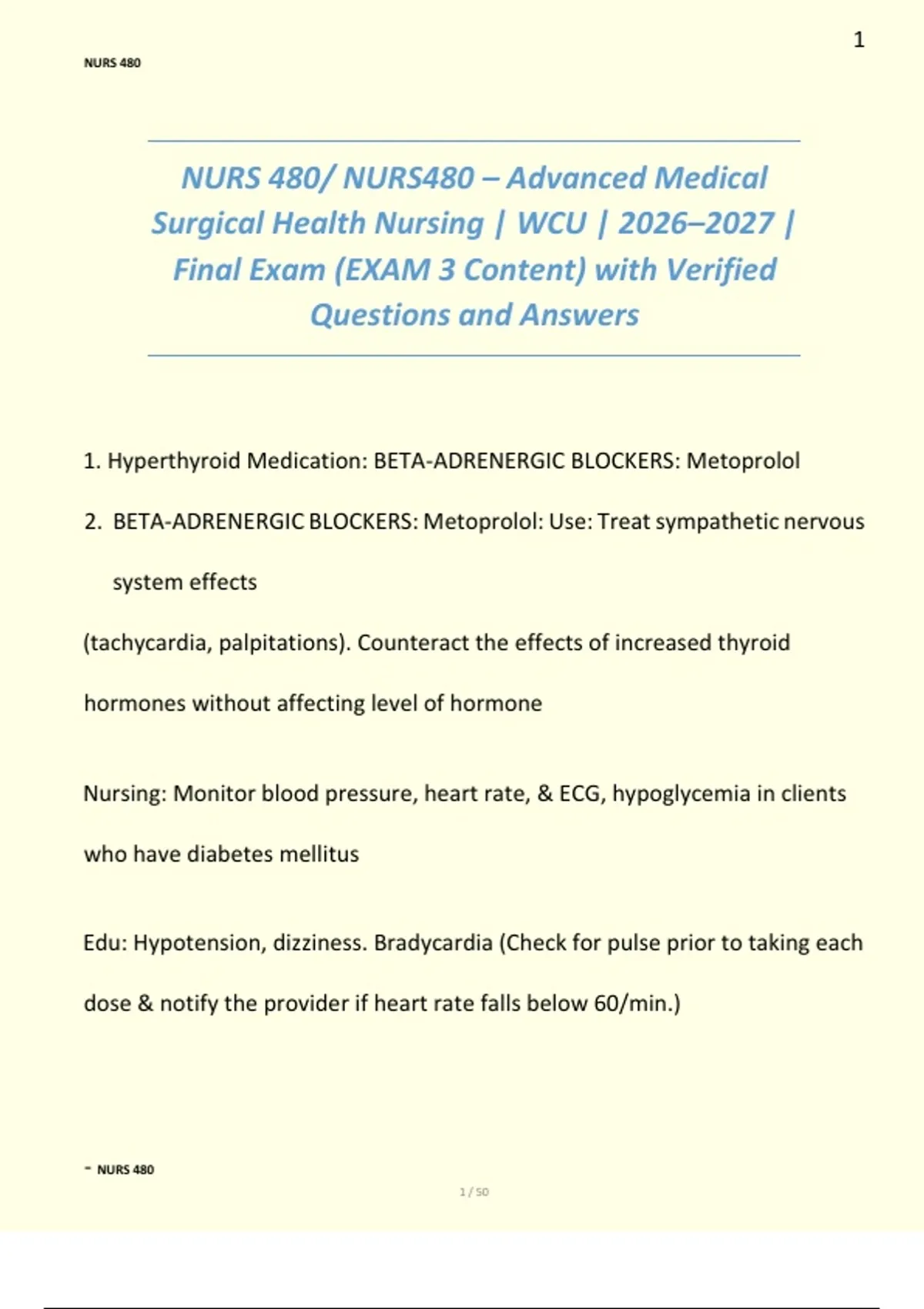 This document covers key concepts from the Advanced Medical Surgical Health Nursing course (NURS 480) at WCU, focusing on the topics commonly assessed in the final exam. It includes verified questions and answers aligned with the 2026–2027 curriculum update. The material is designed to support exam preparation with clear explanations and comprehensive coverage of essential content areas.