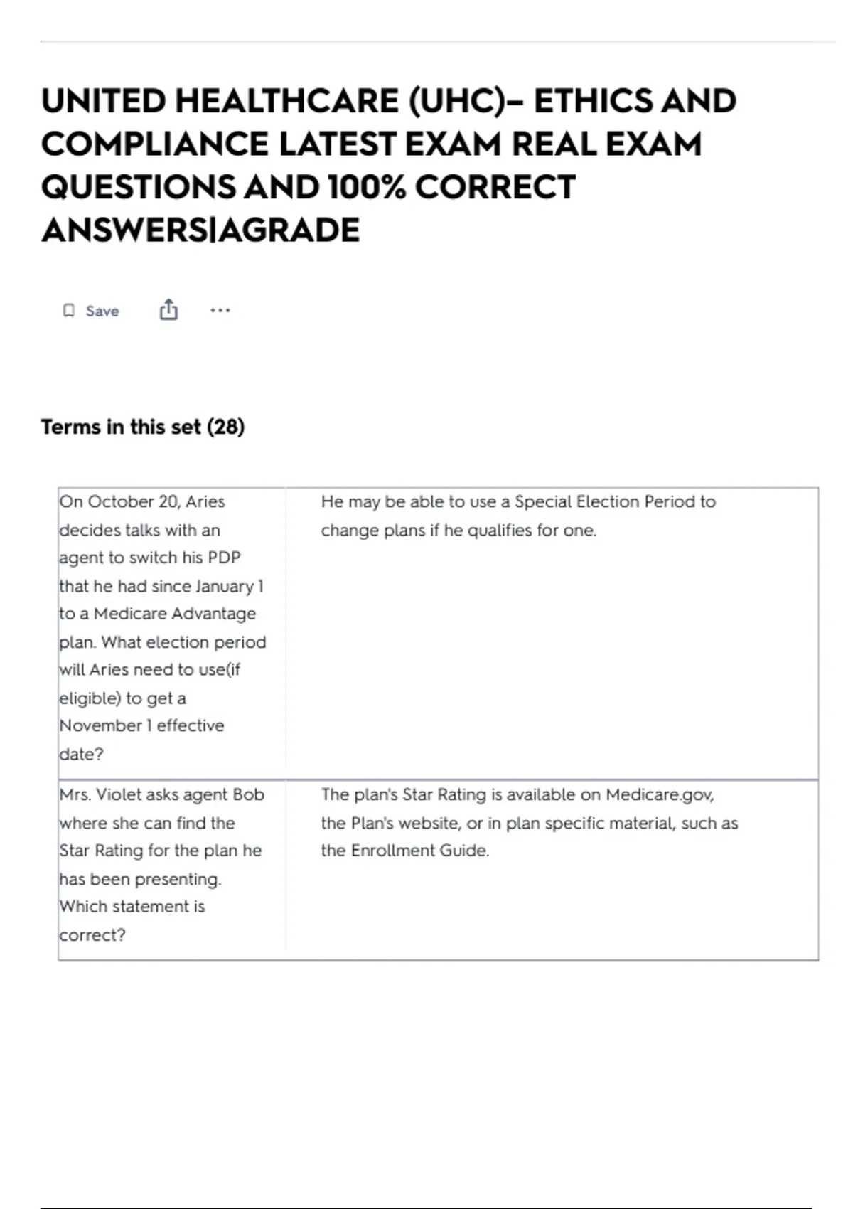 UNITED HEALTHCARE (UHC)– ETHICS AND COMPLIANCE LATEST EXAM REAL EXAM QUESTIONS AND 100% CORRECT ANSWERS|AGRADE