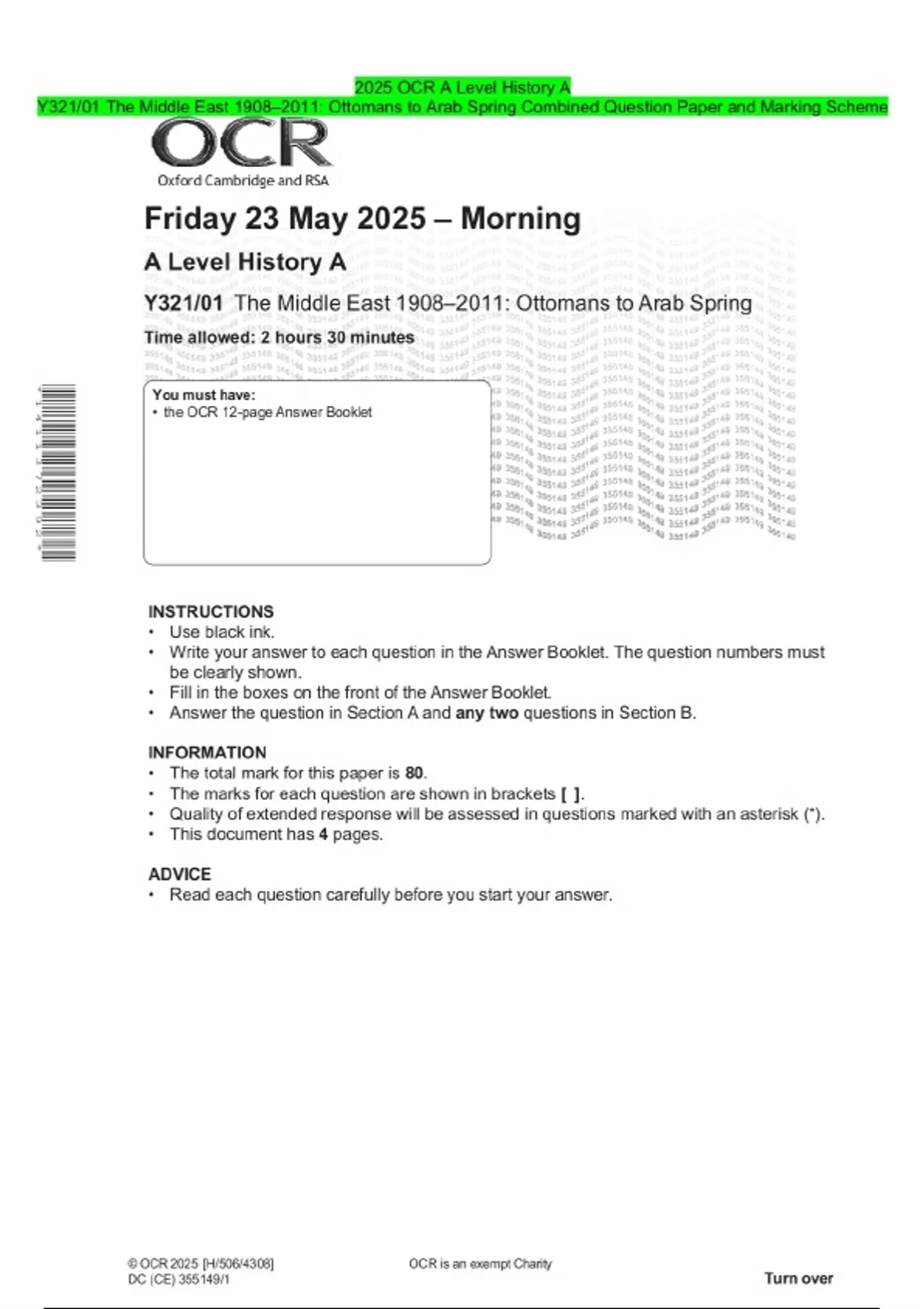 2025 OCR A Level History A Y321/01 The Middle East 1908–2011: Ottomans to Arab Spring Combined Question Paper and Marking Scheme
