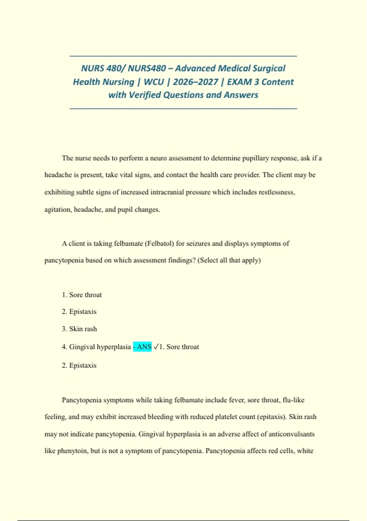 This document covers key concepts from the Advanced Medical Surgical Health Nursing course (NURS 480) at WCU, focusing on the topics commonly assessed in the exam 3. It includes verified questions and answers aligned with the 2026–2027 curriculum update. The material is designed to support exam preparation with clear explanations and comprehensive coverage of essential content areas.