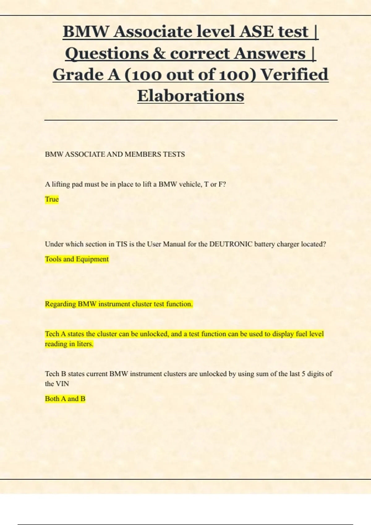 This document provides detailed elaborations and study explanations for core topics relevant to BMW Associate Level and ASE-style competencies. It reviews major automotive systems, diagnostic reasoning, maintenance procedures, and BMW-specific service principles. The material supports learners seeking clearer insight into common exam domains and serves as an in-depth preparation aid without containing real or verified exam questions or answers.