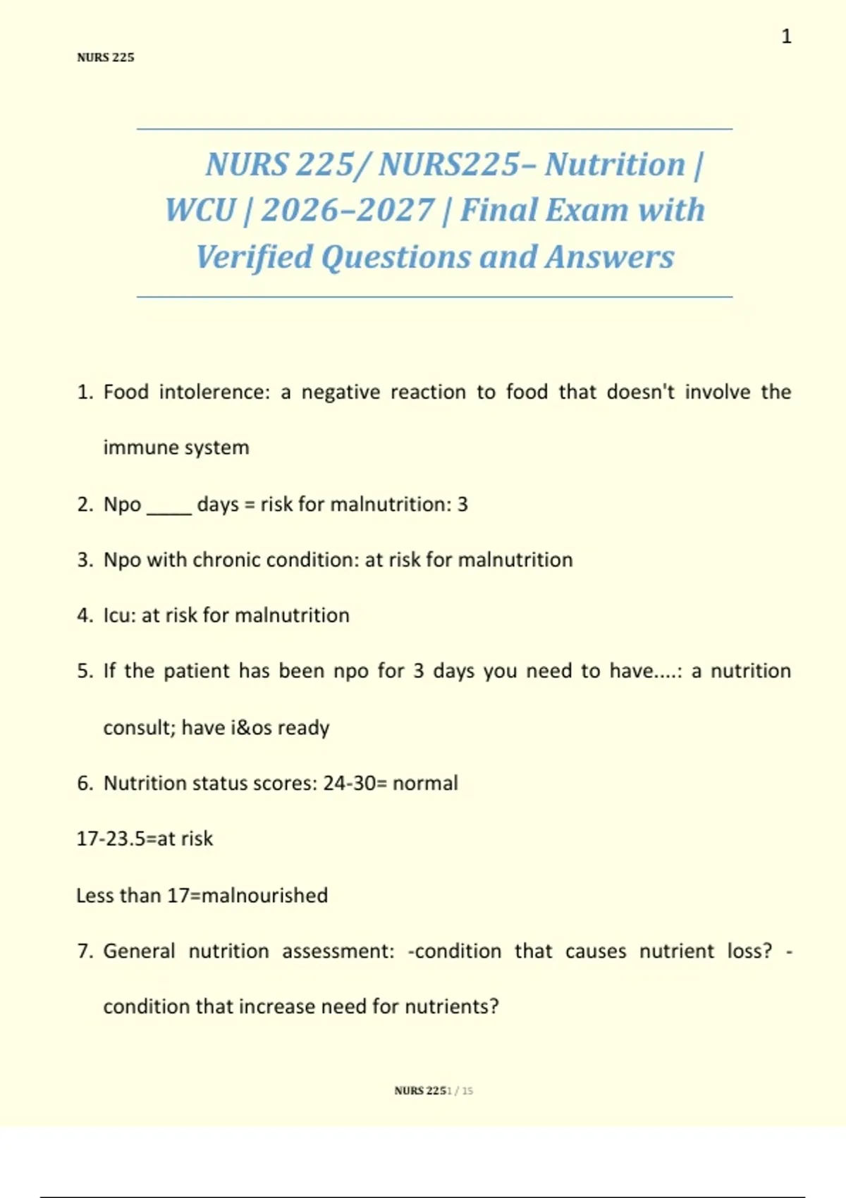 This document covers the major nutrition concepts included in the NURS 225 proctored exam at WCU, aligned with the latest 2026–2027 curriculum update. It contains verified questions and answers that review essential material such as macronutrients, micronutrients, therapeutic diets, and evidence-based nutritional guidelines. The content is designed to help students prepare efficiently and understand the core principles evaluated in the exam.