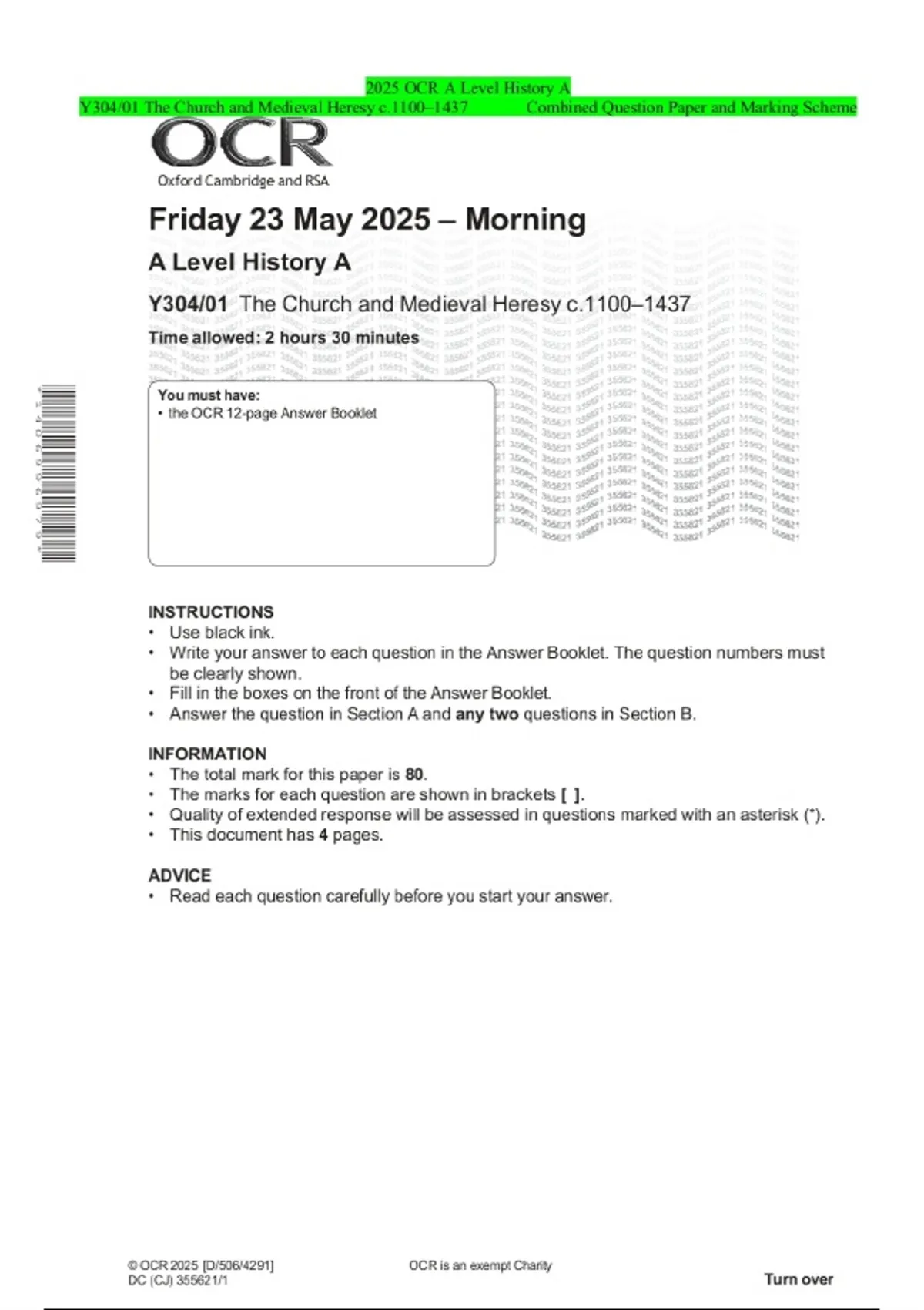 2025 OCR A Level History A Y304/01 The Church and Medieval Heresy c.1100–1437 Combined Question Paper and Marking Scheme