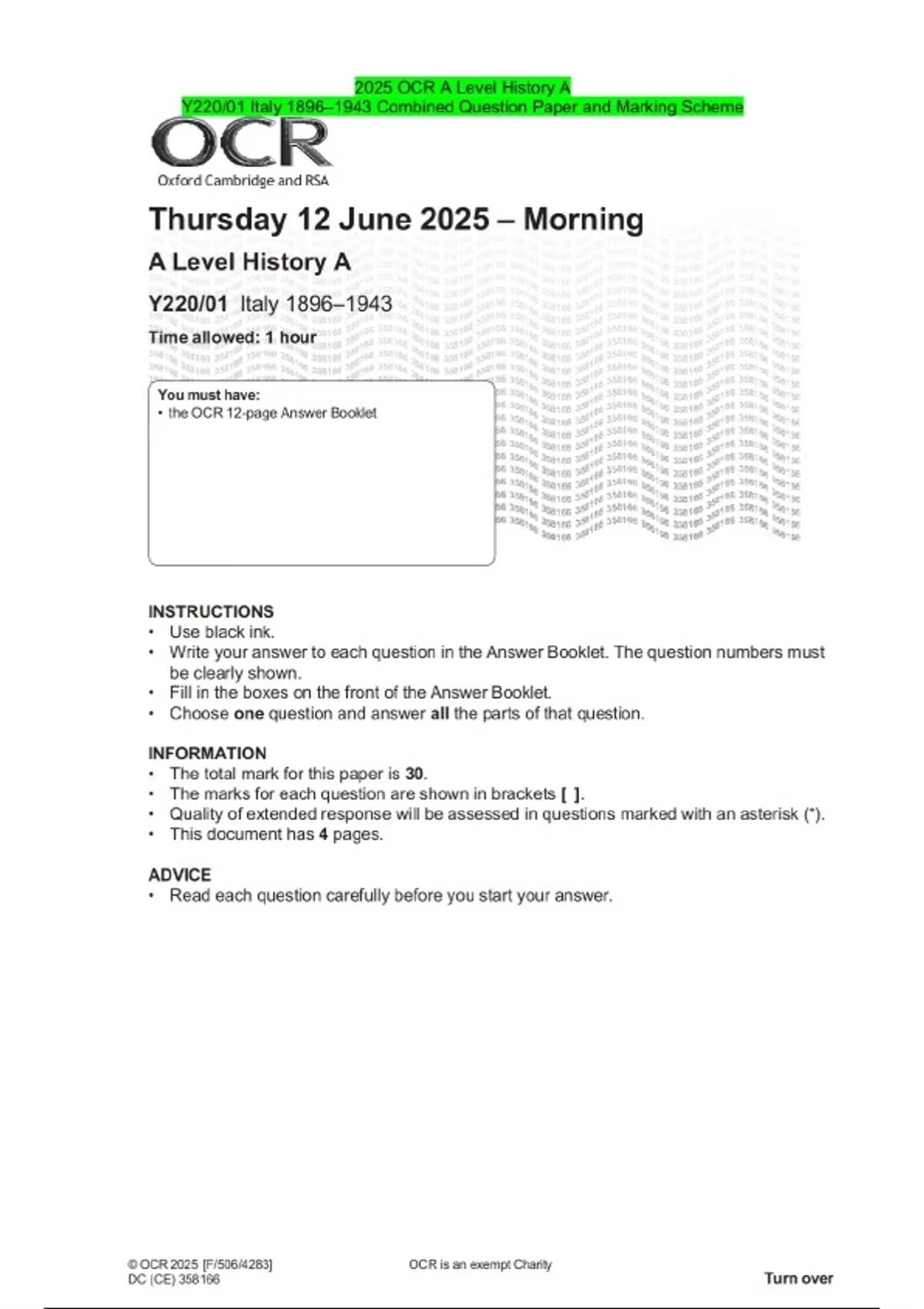 2025 OCR A Level History A Y220/01 Italy 1896–1943 Combined Question Paper and Marking Scheme