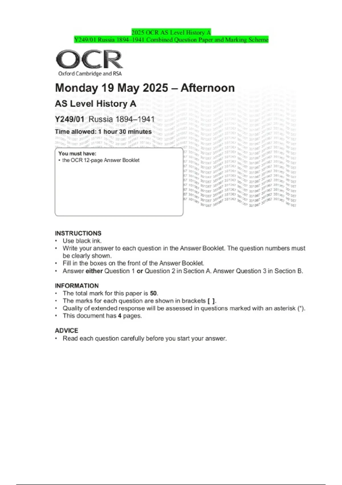 2025 OCR AS Level History A Y249/01 Russia 1894–1941 Combined Question Paper and Marking Scheme