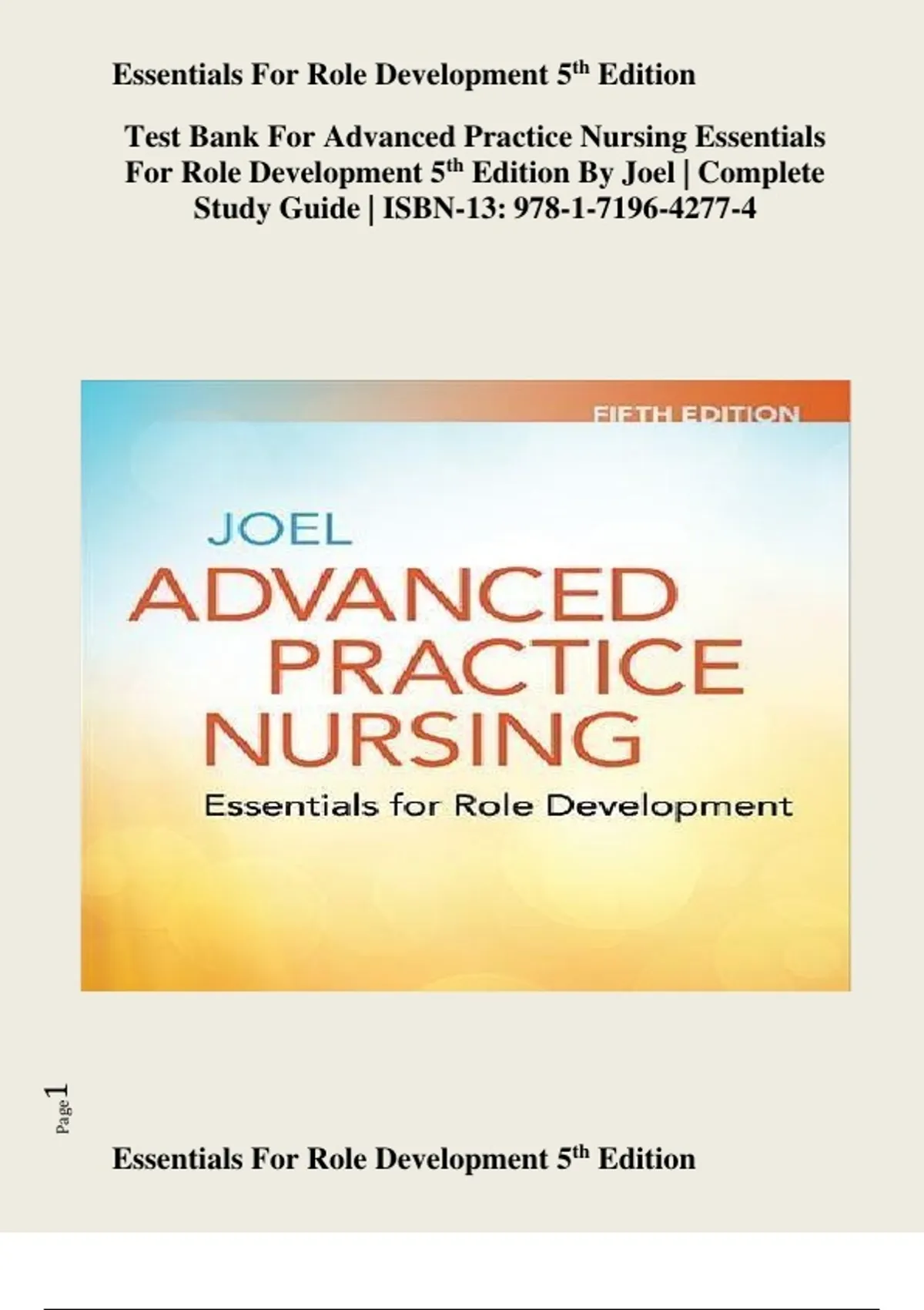 Test Bank For Advanced Practice Nursing Essentials For Role Development 5th Edition By Joel | Complete Study Guide | ISBN-13: 978-1-7196-4277-4