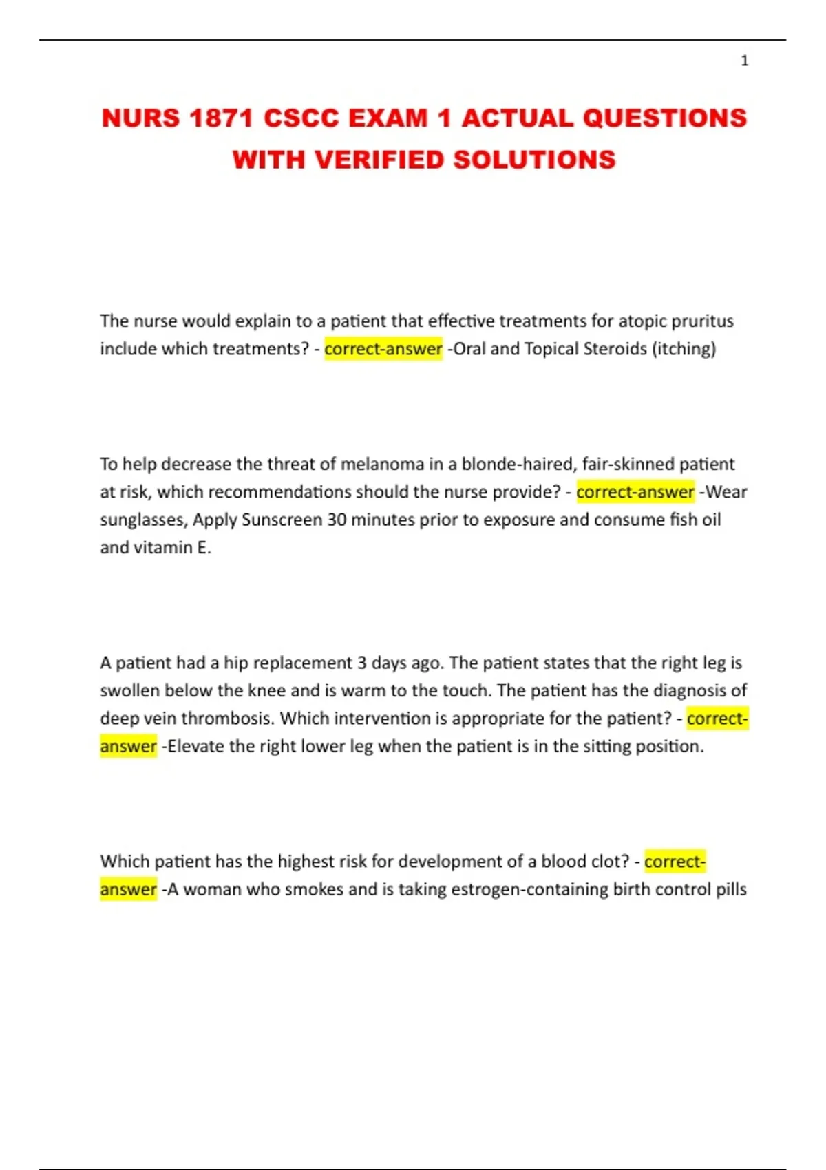 NURS 1871 CSCC EXAM 1 ACTUAL QUESTIONS WITH VERIFIED SOLUTIONS