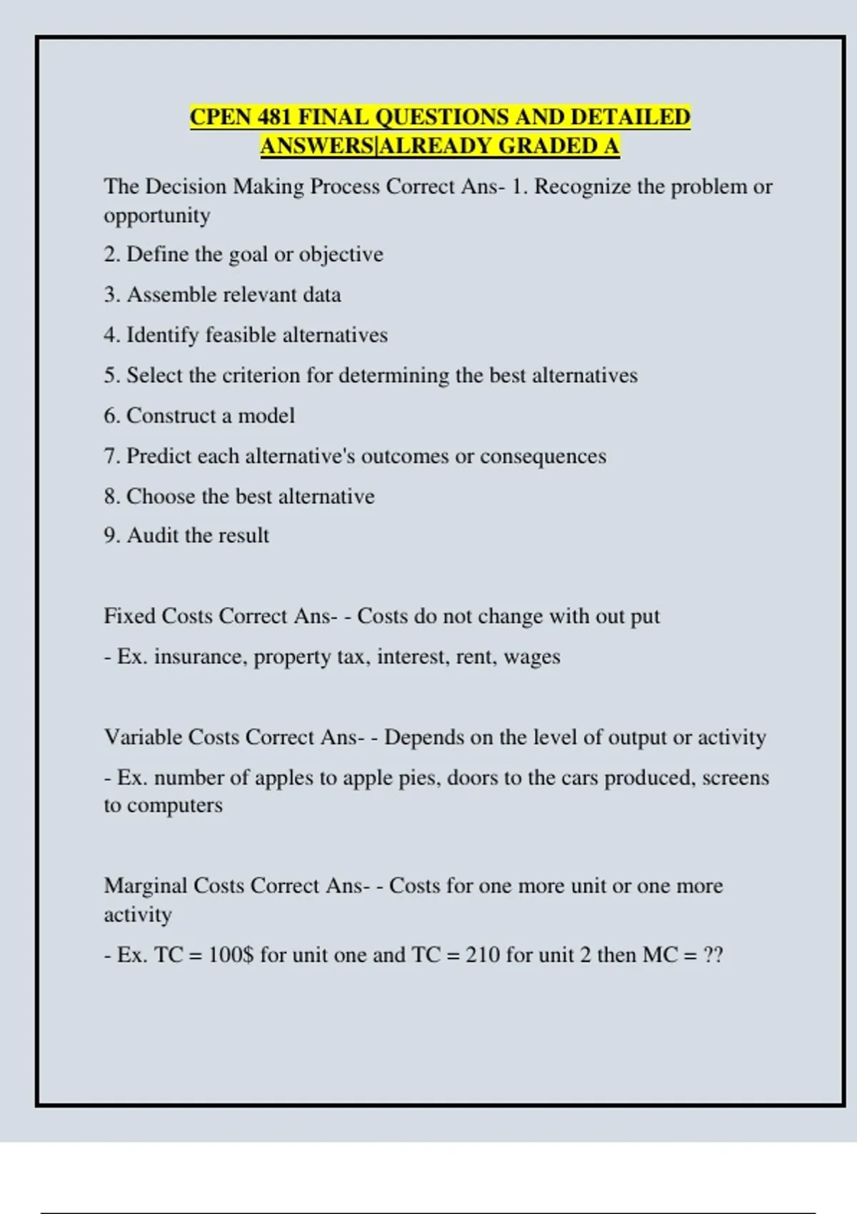 The Decision Making Process Correct Ans- 1. Recognize the problem or opportunity 2. Define the goal or objective 3. Assemble relevant data 4. Identify feasible alternatives 5. Select the criterion for determining the best alternatives 6. Construct a model 7. Predict each alternative's outcomes or consequences 8. Choose the best alternative 9. Audit the result Fixed Costs Correct Ans- - Costs do not change with out put - Ex. insurance, property tax, interest, rent, wages