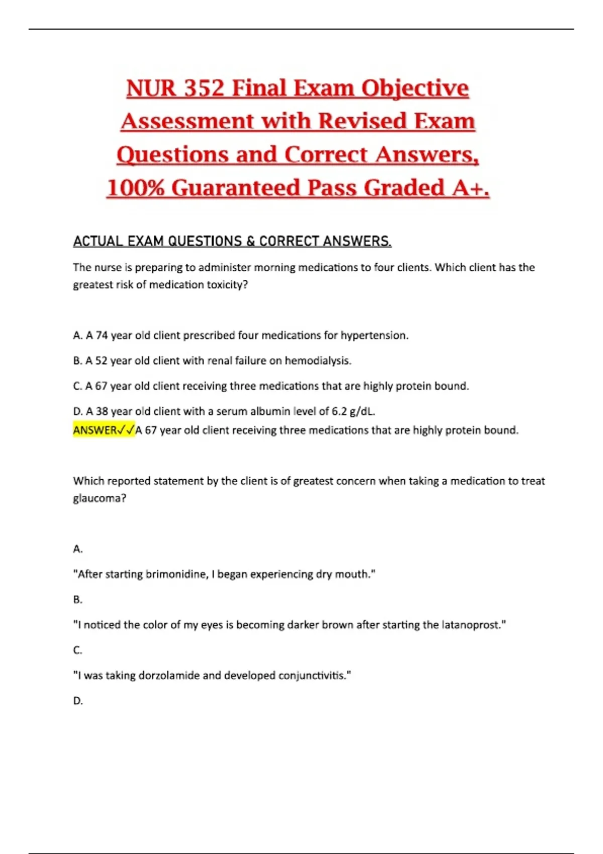 This document provides the revised objective-style Final Exam questions for NUR 352 together with the correct answers. It covers the full range of nursing concepts, clinical applications, and advanced topics assessed in the final portion of the course. The material is organized to support comprehensive, exam-focused preparation and aligns with the structure and expectations of typical NUR 352 final examinations.This document provides the revised objective-style Final Exam questions for NUR 352 together with the correct answers. It covers the full range of nursing concepts, clinical applications, and advanced topics assessed in the final portion of the course. The material is organized to support comprehensive, exam-focused preparation and aligns with the structure and expectations of typical NUR 352 final examinations.This document provides the revised objective-style Final Exam questions for NUR 352 together with the correct answers. It covers the full range of nursing concepts, clinical applications, and advanced topics assessed in the final portion of the course. The material is organized to support comprehensive, exam-focused preparation and aligns with the structure and expectations of typical NUR 352 final examinations.