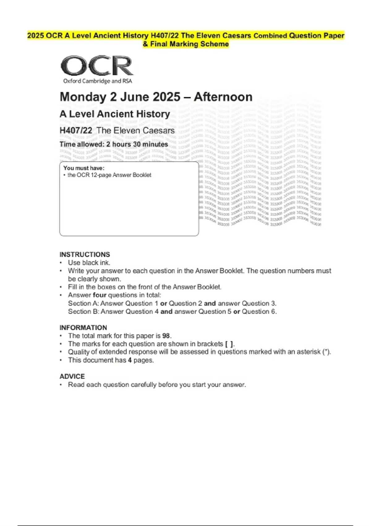 2025 OCR A Level Ancient History H407/22 The Eleven Caesars Question Paper and Marking Scheme