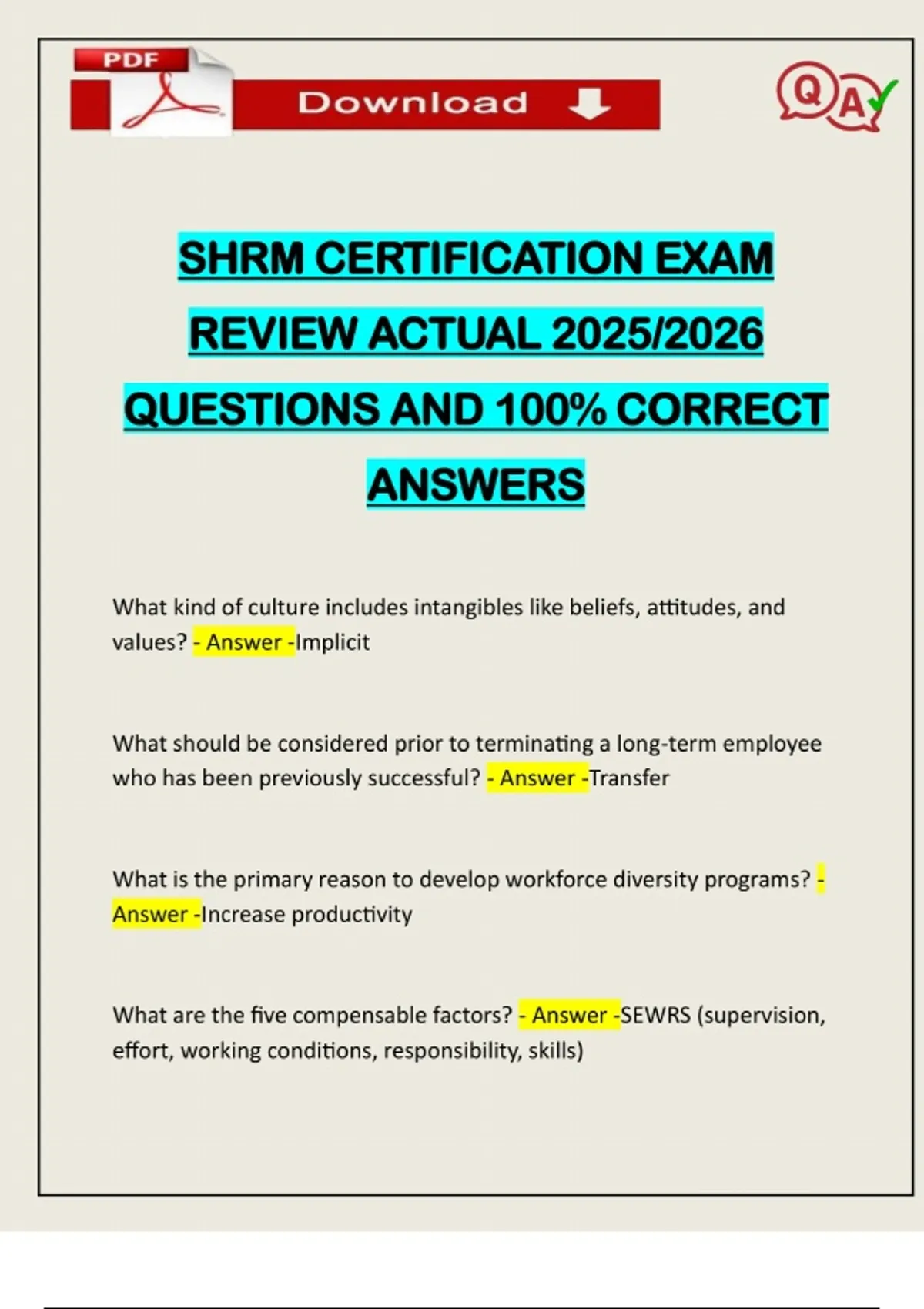 SHRM CERTIFICATION EXAM REVIEW ACTUAL 2025/2026 QUESTIONS AND 100% CORRECT ANSWERS What kind of culture includes intangibles like beliefs, attitudes, and values? - Answer -Implicit What should be considered prior to terminating a long-term employee who has been previously successful? - Answer -Transfer What is the primary reason to develop workforce diversity programs? - Answer -Increase productivity What are the five compensable f