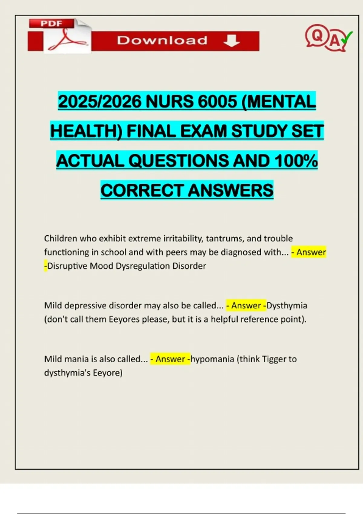 2025/2026 NURS 6005 (MENTAL HEALTH) FINAL EXAM STUDY SET ACTUAL QUESTIONS AND 100% CORRECT ANSWERS Children who exhibit extreme irritability, tantrums, and trouble functioning in school and with peers may be diagnosed with... - Answer -Disruptive Mood Dysregulation Disorder Mild depressive disorder may also be called... - Answer -Dysthymia (don't call them Eeyores please, but it is a helpful reference point). Mild mania is also called... - Answer -hypomania (think Tigger to dysthymia's Eeyore)Need assistance on Online classes, Exams & Assignments? Reach out for instant help!! Full Course Assistance, Plagiarism-free Essay Writing, Research Paper, Dissertation, Discussion Posts, etc…. Confidential & Secure services. Tutors are available for all subjects! Email now at: Mild Bipolar disorder, which manifests as cycling between mania and depression for at least two years (to meet clinical diagnosis requirements) is also called... - Answer -Cyclothymia What are some other conditions or illnesses that may manifest with symptoms of depression? (Hint, think HH: Head and Hormones). - Answer -Cognitive Disorders: -Parkinson's -Huntington's -TBI Hormonal Imbal