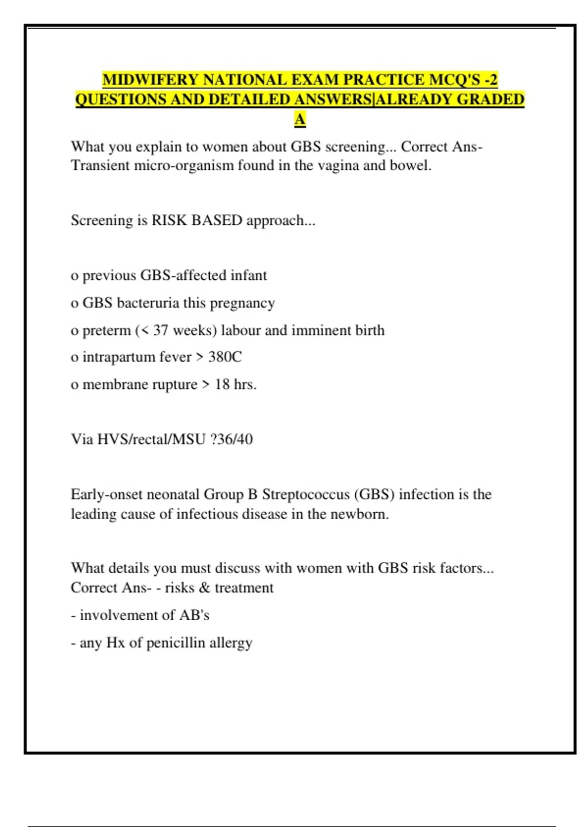 What you explain to women about GBS screening... Correct Ans- Transient micro-organism found in the vagina and bowel. Screening is RISK BASED approach... o previous GBS-affected infant o GBS bacteruria this pregnancy o preterm ( 37 weeks) labour and imminent birth o intrapartum fever 380C o membrane rupture 18 hrs. Via HVS/rectal/MSU ?36/40 Early-onset neonatal Group B Streptococcus (GBS) infection is the leading cause of infectious disease in the newborn. What details you must discuss with women with GBS risk factors... Correct Ans- - risks & treatment - involvement of AB's - any Hx of penicillin allergy