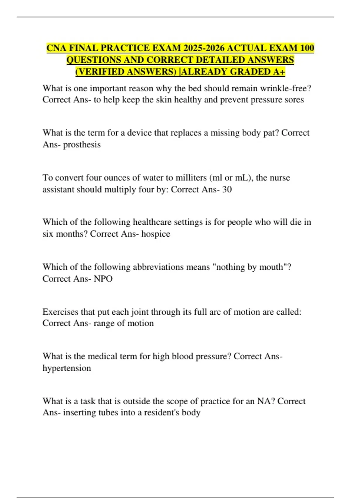 What is one important reason why the bed should remain wrinkle-free? Correct Ans- to help keep the skin healthy and prevent pressure sores What is the term for a device that replaces a missing body pat? Correct Ans- prosthesis To convert four ounces of water to milliters (ml or mL), the nurse assistant should multiply four by: Correct Ans- 30 Which of the following healthcare settings is for people who will die in six months? Correct Ans- hospice Which of the following abbreviations means "nothing by mouth"? Correct Ans- NPO Exercises that put each joint through its full arc of motion are called: Correct Ans- range of motion