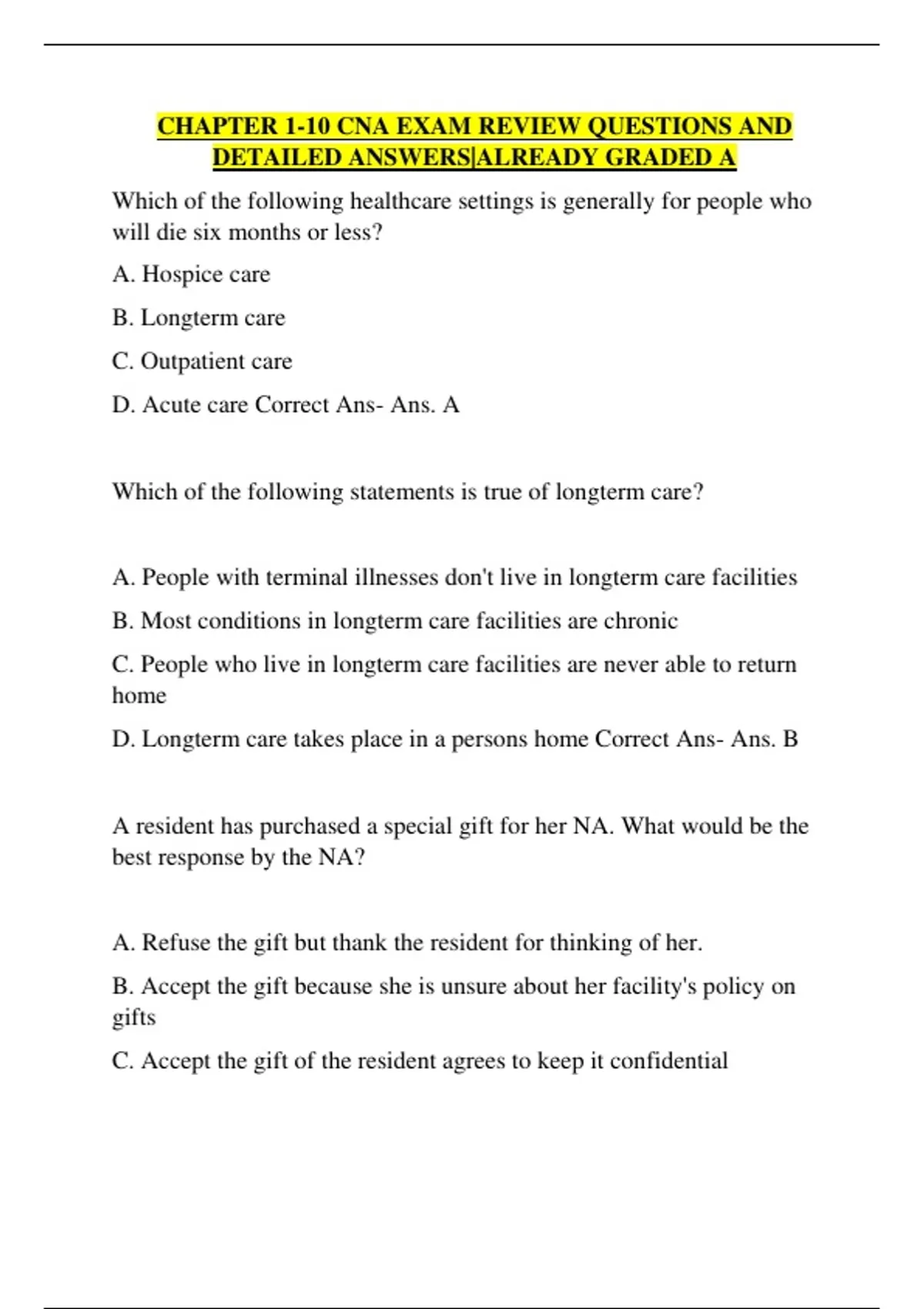 Which of the following healthcare settings is generally for people who will die six months or less? A. Hospice care B. Longterm care C. Outpatient care D. Acute care Correct Ans- Ans. A Which of the following statements is true of longterm care? A. People with terminal illnesses don't live in longterm care facilities B. Most conditions in longterm care facilities are chronic C. People who live in longterm care facilities are never able to return home D. Longterm care takes place in a persons home Correct Ans- Ans. B A resident has purchased a special gift for her NA. What would be the best response by the NA?