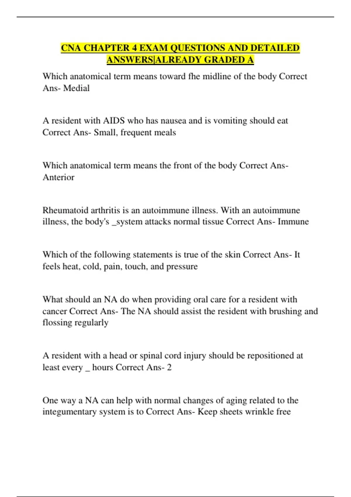 Which anatomical term means toward fhe midline of the body Correct Ans- Medial A resident with AIDS who has nausea and is vomiting should eat Correct Ans- Small, frequent meals Which anatomical term means the front of the body Correct Ans- Anterior Rheumatoid arthritis is an autoimmune illness. With an autoimmune illness, the body's _system attacks normal tissue Correct Ans- Immune Which of the following statements is true of the skin Correct Ans- It feels heat, cold, pain, touch, and pressure What should an NA do when providing oral care for a resident with cancer Correct Ans- The NA should assist the resident with brushing and flossing regularly