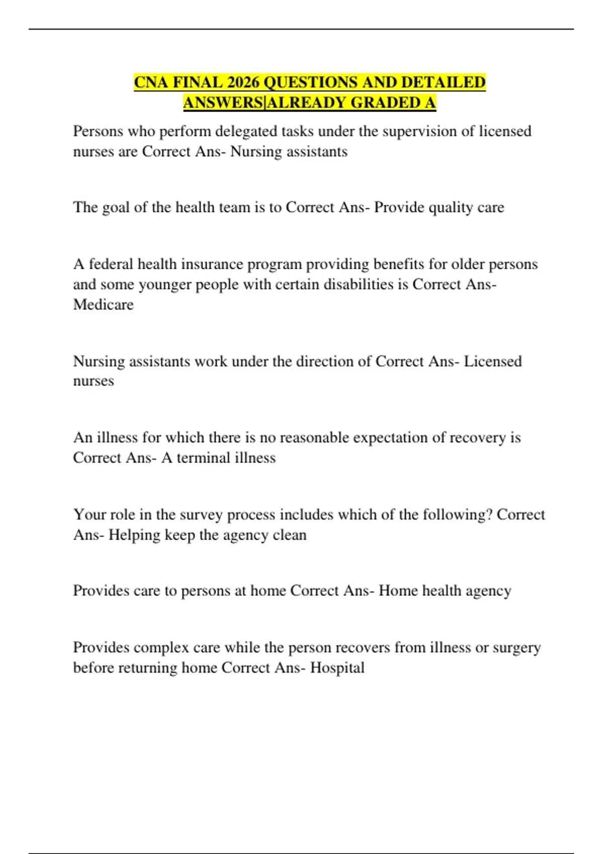 As a nursing assistant, you Correct Ans- Are responsible for your own