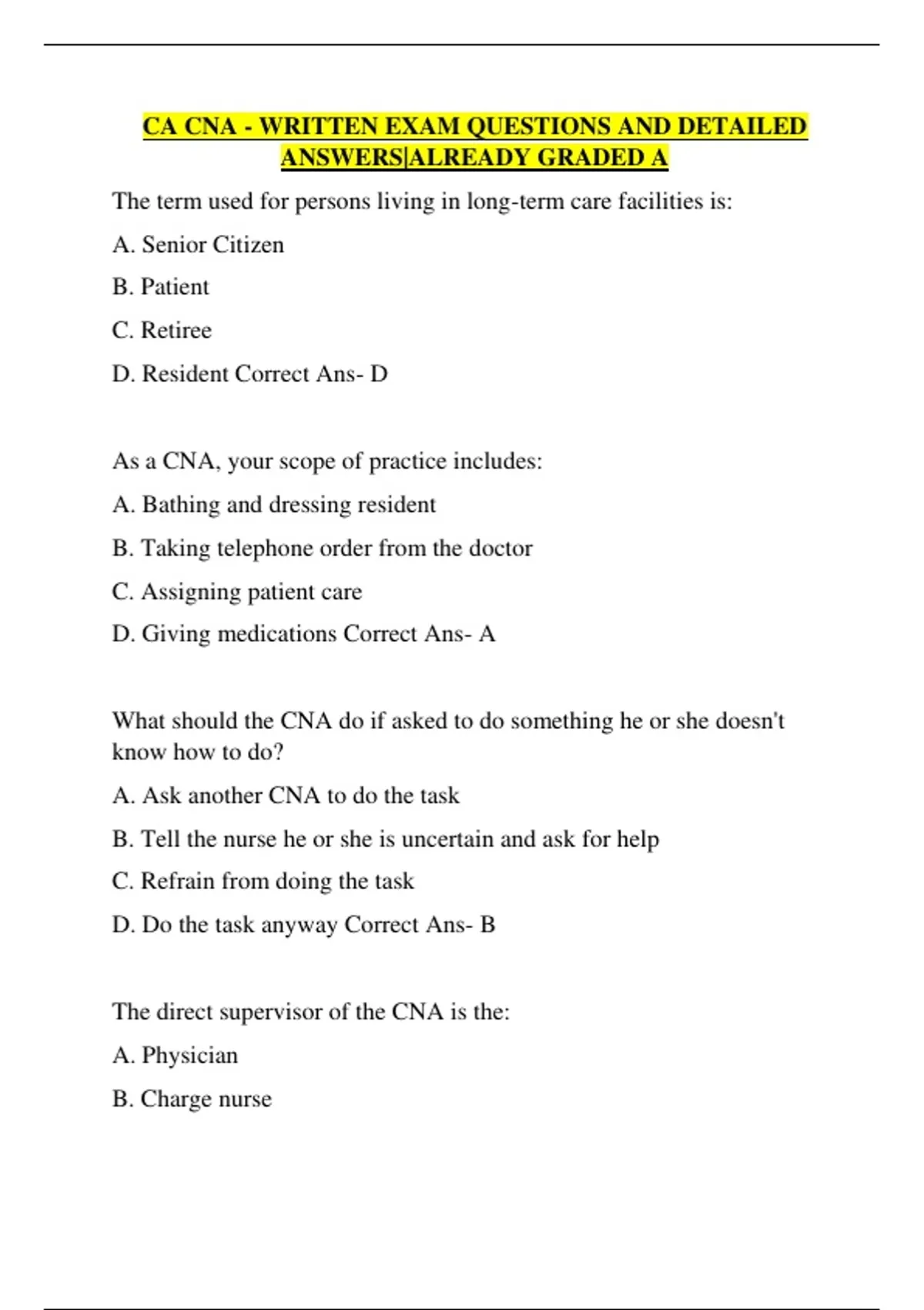 CA CNA - WRITTEN EXAM QUESTIONS AND DETAILED ANSWERS|ALREADY GRADED A