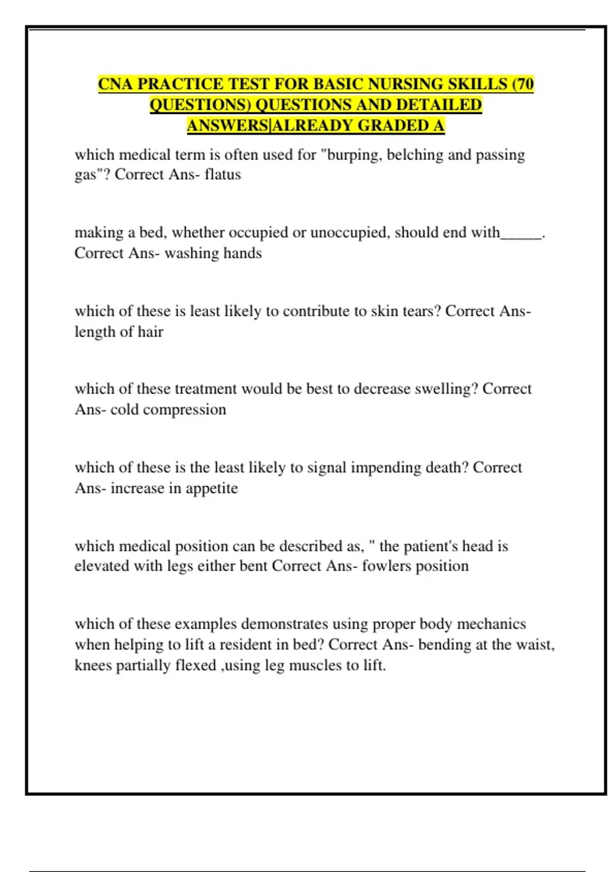 CNA PRACTICE TEST FOR BASIC NURSING SKILLS (70 QUESTIONS) QUESTIONS AND DETAILED ANSWERS|ALREADY GRADED A