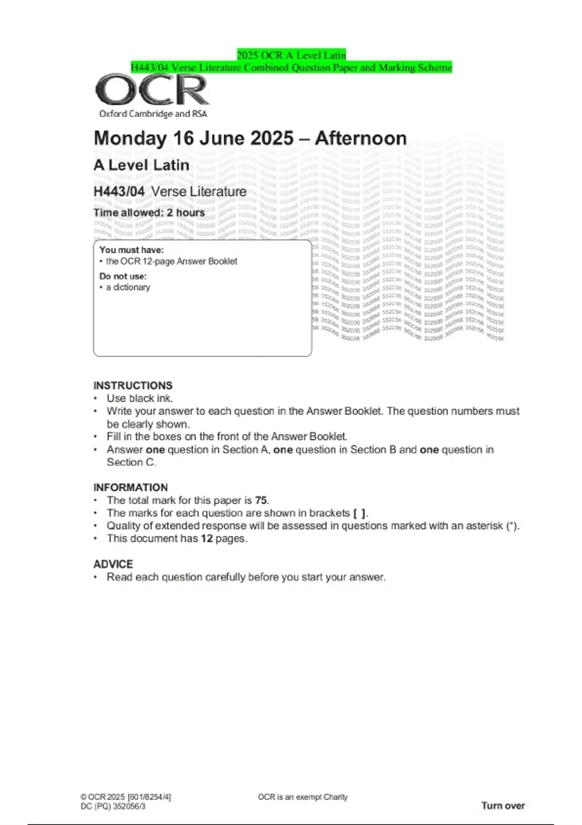 2025 OCR A Level Latin H443/04 Verse Literature Combined Question Paper and Marking Scheme
