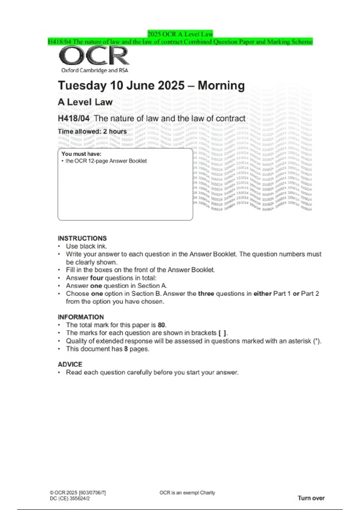 2025 OCR A Level Law H418/04 The nature of law and the law of contract Combined Question Paper and Marking Scheme