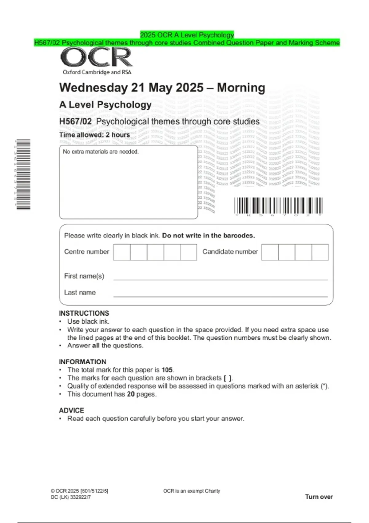 2025 OCR A Level Psychology H567/02 Psychological themes through core studies Combined Question Paper and Marking Scheme