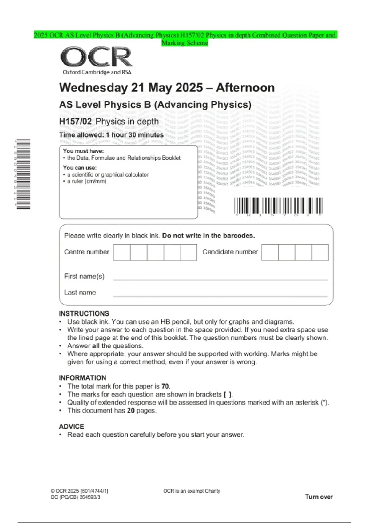 2025 OCR AS Level Physics B (Advancing Physics) H157/02 Physics in depth Combined Question Paper and Marking Scheme