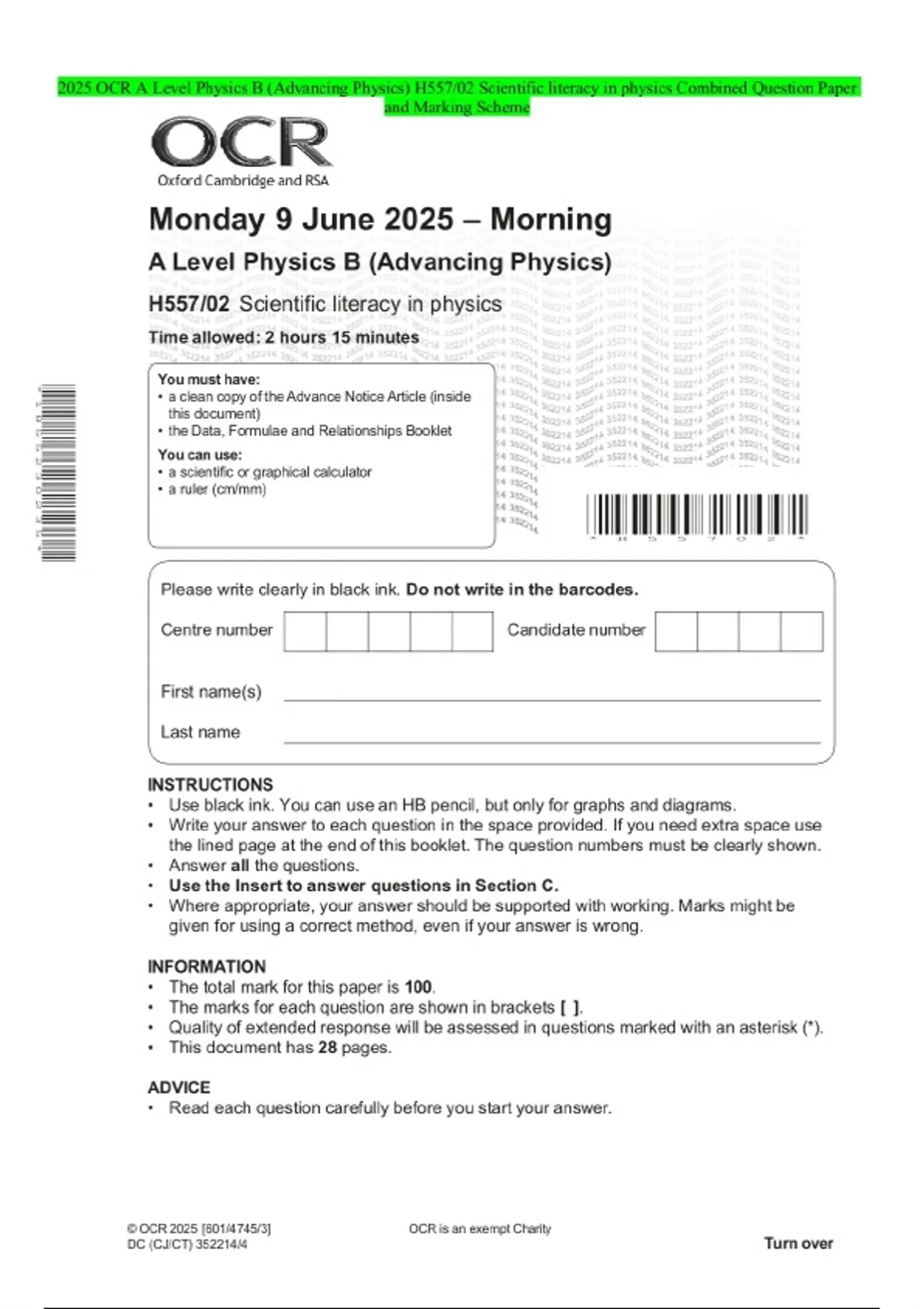 2025 OCR A Level Physics B (Advancing Physics) H557/02 Scientific literacy in physics Combined Question Paper and Marking Scheme