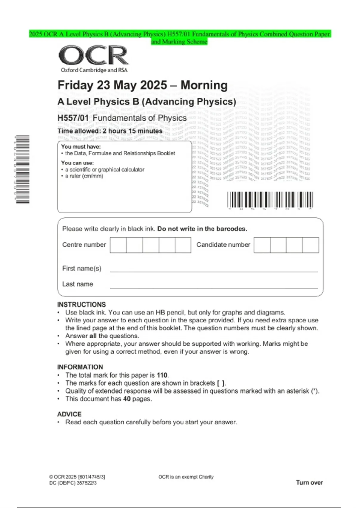 2025 OCR A Level Physics B (Advancing Physics) H557/01 Fundamentals of Physics Combined Question Paper and Marking Scheme